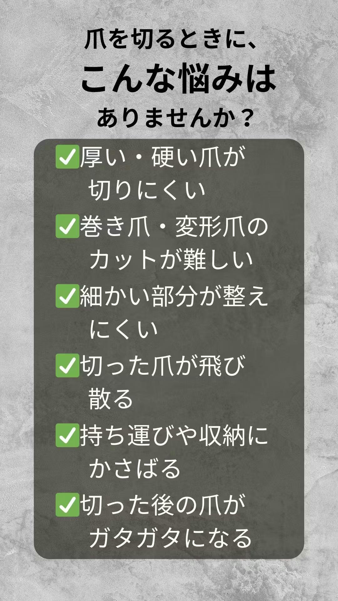 私たちは、日常生活の「ちょっとした不便」を解決するアイデア商品を提案しているチームです。爪切りは長年ほとんど形を変えておらず、「厚い爪が切りにくい」「巻き爪が処理しづらい」「切った爪が飛び散る」など、日々の小さなストレスが意外と多いことに気づきました。