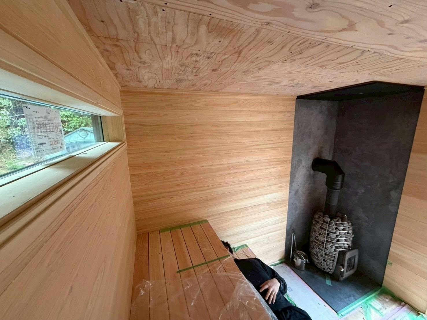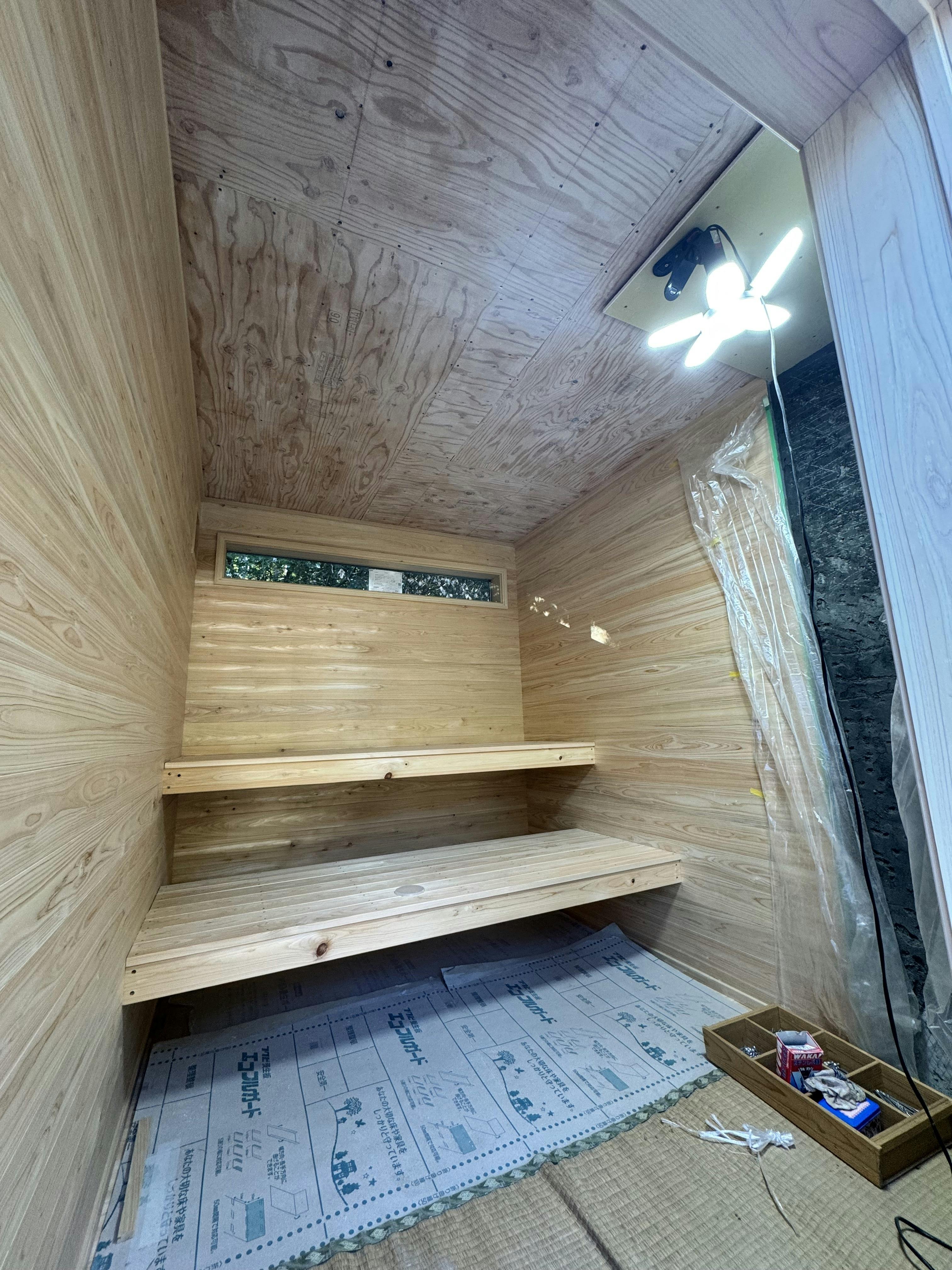 安全面を第一に考えるとさまざまな制限がかかります。地域によっても消防の規定が異なるとは分かっていましたが、理想と現実は異なる部分が多く、簡単なものではなかったことも勉強になりました。ただ、座面の広さや天井までの高さ、檜材で仕上げること、サウナストーブをベンチに座った時に見える設計にすることは、理想のサウナを作る上で非常に重要でした。無事、温度試験も終了し安全に入っていただけるサウナが完成致しました!!