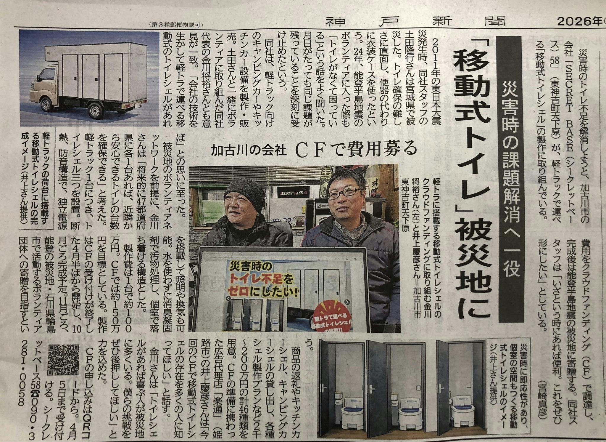 2026/02/12 11:56私たちSECRETBASE58のクラウドファンディングプロジェクト「軽トラックで運べる移動式トイレシェル」が、地元・神戸新聞(2026年2月12日付)に掲載されました!被災地でのトイレ不足という現実と、そこから生まれたこのプロジェクトの想いを、とても丁寧に取り上げていただきました。記事では、被災経験のあるスタッフ・土田の体験や、代表・金川の「自分たちの技術で人の役に立ちたい」という想い、そして軽トラックを使った“移動式トイレシェル”の仕組みや特徴も紹介されています。地元の皆さんにもこの挑戦を知っていただけたこと、そして「こういう活動をしている人がいるんだね」と温かい声をかけていただけたことが、私たちにとって大きな励みになっています。被災地で困っている方に“安心できるトイレ空間”を届けたい。その一心で始めたこの挑戦が、少しずつ多くの方に届いていることを実感しています。これからも製作・寄贈に向けて一歩ずつ進んでまいります。引き続き、ご支援・応援をどうぞよろしくお願いいたします。 もっと見る