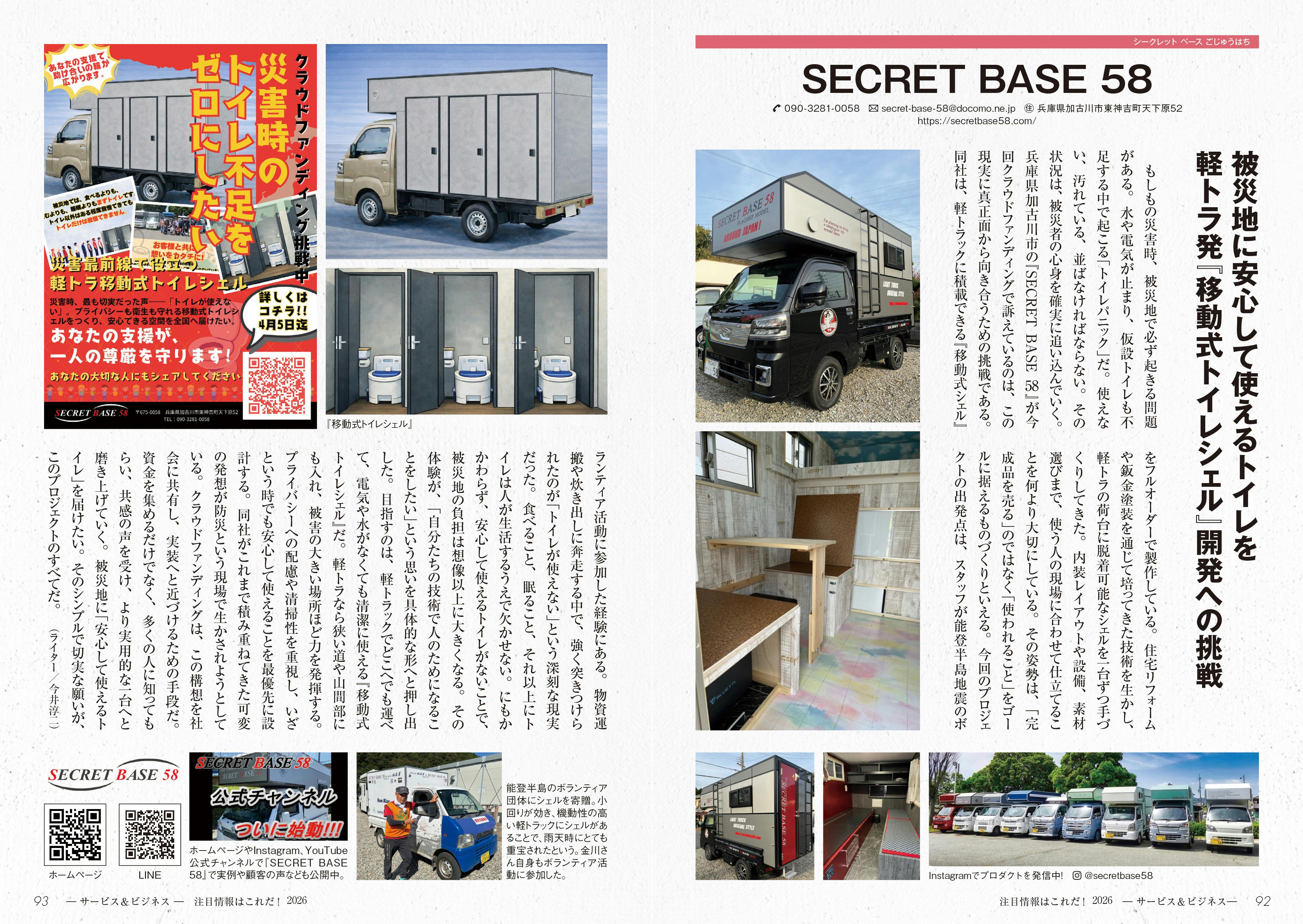 2026/03/10 14:57皆さま、いつも温かいご支援ありがとうございます。本日発売の雑誌 「注目情報はこれだ!2026」 にて、SECRET BASE 58 と今回の 「移動式トイレシェル」プロジェクト を紹介していただきました。誌面では、・災害時のトイレ問題への想い・軽トラックで運べる移動式トイレシェルの構想・これまでの取り組みなどについて掲載していただいています。このような形で全国の読者の方に取り上げていただけたことを、とても嬉しく思っています。このプロジェクトはまだ始まったばかりですが、一人でも多くの方に「災害時のトイレ問題」を知っていただき、そして被災地に安心して使えるトイレを届けるための第一歩にしたいと考えています。今回の掲載をきっかけに、さらに多くの方にこの取り組みを知っていただければ嬉しいです。引き続き、応援・シェアのご協力をよろしくお願いいたします! もっと見る