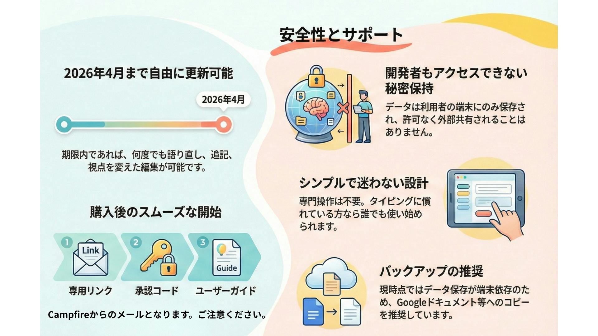 また、「最初の使い方ガイド」で、つまずきやすいポイントのフォローもご用意しています。それでも不安な場合は、個別にご相談ください。できる範囲でサポートします。
