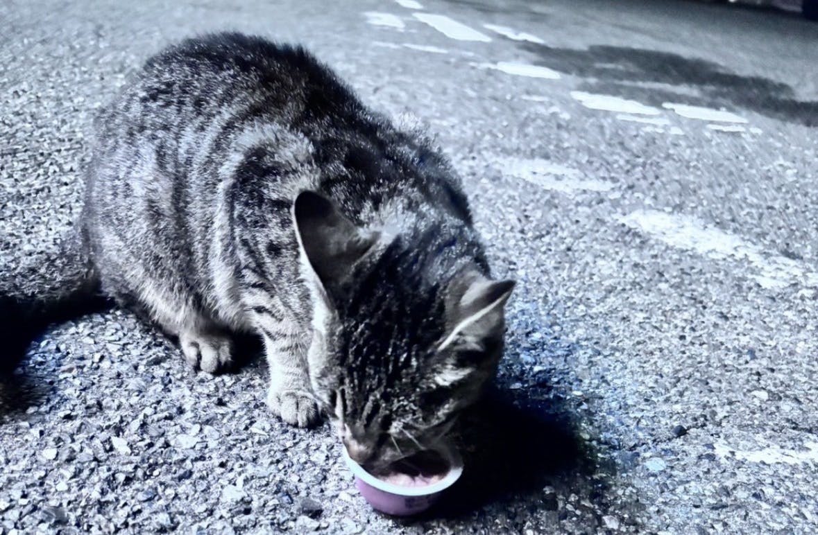 コンビニでお腹を空かせて餌をもらえるのをずーっと待っていました。