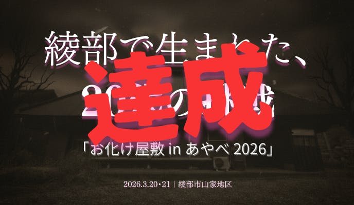 2026/03/04 09:00いつも応援いただきありがとうございます。お化け屋敷 in あやべ 2026 実行チーム代表の小西英です。このたび、僕達の挑戦に関するクラウドファンディングにおいて、111,500円のご支援をいただき、目標金額を達成のうえ、無事終了いたしましたことをご報告いたします。本プロジェクトは、26名の支援者の皆さまお一人おひとりのお力添えによって実現することができました。本当にありがとうございます。地元・綾部市にて、「変わらない日常に変化を創りたい」「地元を盛り上げたい」。その想いで立ち上げた、地元20代のチームによるこの挑戦に、多くの応援をいただけたことがとても嬉しく、また僕達のしていることは間違っていないという自信になりました。皆さまからお預かりしたご支援は、お化け屋敷の演出強化、装飾制作、安全対策などに使用させていただきます。「何もない田舎」ではなく、“ここでしか味わえない、盛り上がっている場所”へ。このイベントを通じて、京都北部の活性化につながる一歩を確実に踏み出していきます。イベント開催まで、残り約2週間となりました。引き続き、一つひとつを丁寧に、着実に、そしてなによりも僕たちが楽しみながら準備を進めていきます。今後も準備の様子や進捗は活動報告としてお届けいたします。ぜひ引き続き見守っていただけましたら幸いです。【下記公式Instagramにて毎日準備の様子を発信中!】アカウントをフォローして最新情報を受け取ってください!https://www.instagram.com/ayabe_ibent/改めまして、温かいご支援に心より感謝申し上げます。今後ともどうぞよろしくお願いいたします。僕達はこれからも走り続けます。お化け屋敷 in あやべ 2026 実行チーム代表 小西 英 もっと見る
