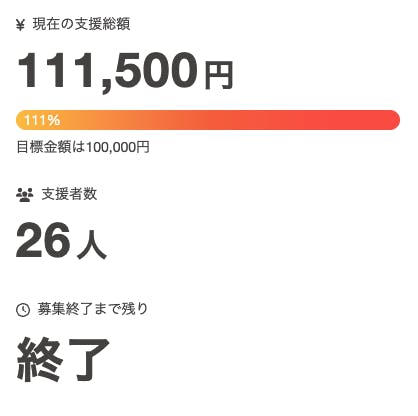 このたび、僕達の挑戦に関するクラウドファンディングにおいて、111,500円のご支援をいただき、目標金額を達成のうえ、無事終了いたしましたことをご報告いたします。