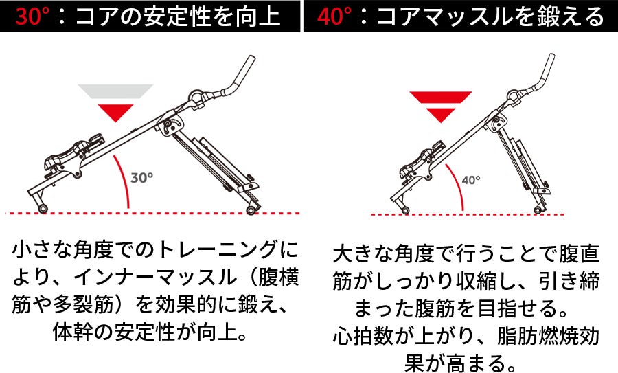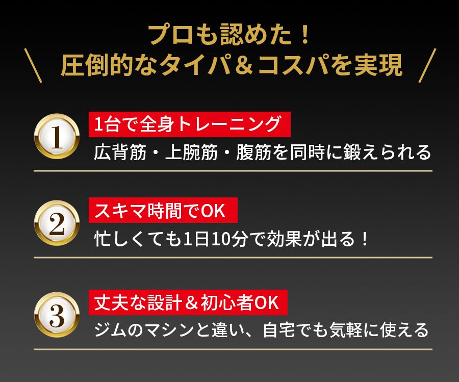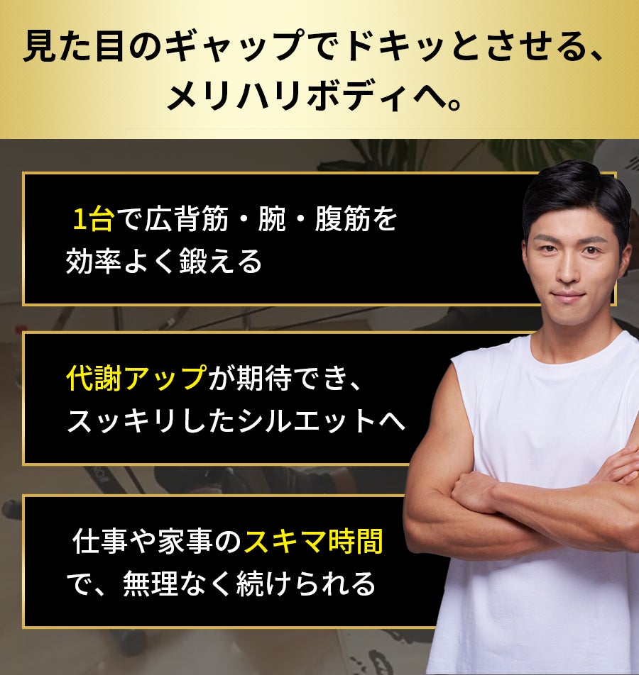 A:1台で「広背筋・腕・腹筋」を効率的に鍛えられます!・ローイングモード → 背中&体幹サポート・アームトレーニングモード → 上腕&肩の引き締め・アブドミナルモード → 腹筋&ウエストシェイプ