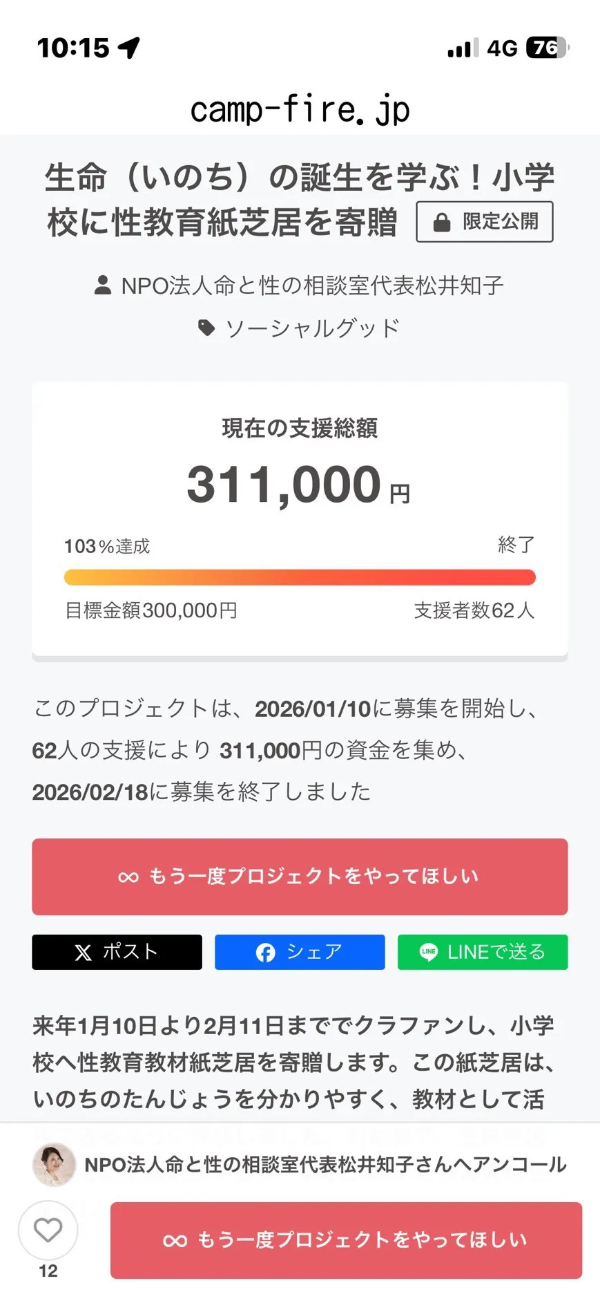 2026/02/19 17:37「子どもたちの未来を守りたい」その一心で駆け抜けたこの期間、皆様の応援がどれほど心強かったか言葉に尽くせません。お陰様で、目標達成という最高の形でプロジェクトを締めくくることができました!共に歩んでくださった皆様、本当に、本当にありがとうございます。支援という形だけでなく、皆様と「未来」を語り合えたことが、私にとって最大の財産です。来年度もその想いを胸に、さらに尽力してまいります。次なる挑戦は、兵庫大学さんとのコラボによる「性教育紙芝居」です。ジェンダーについて、子どもたちが正しく、楽しく学べるツールを心を込めて作り上げます。作成した紙芝居の絵本化も取り組んでいきます。私たちの挑戦はまだ始まったばかりです。これからも、子どもたちの笑顔のために、一緒に歩んでいただけたら嬉しいです! もっと見る
