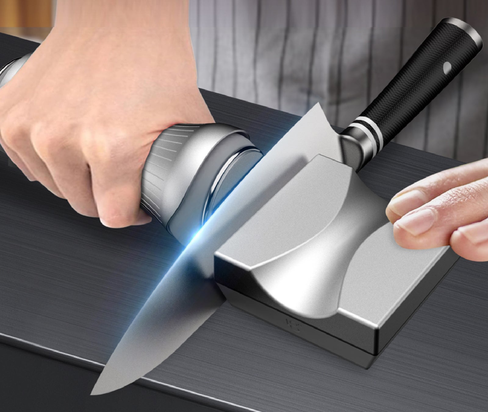 素人が砥石で研ぐと一定の角度を保てませんが、【KiruTone】はガイドに強力マグネットを内蔵し、刃物をガッチリ固定します。