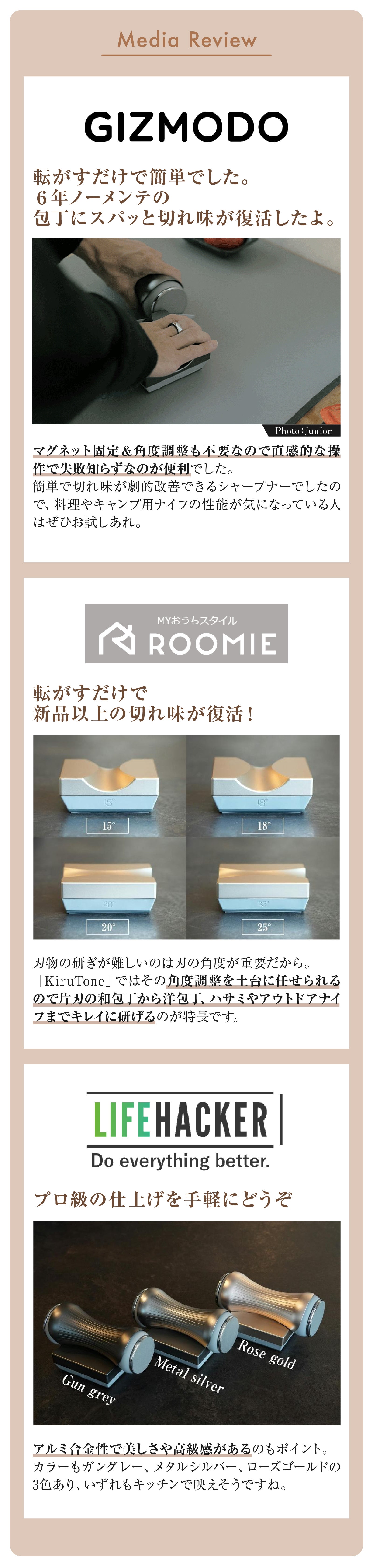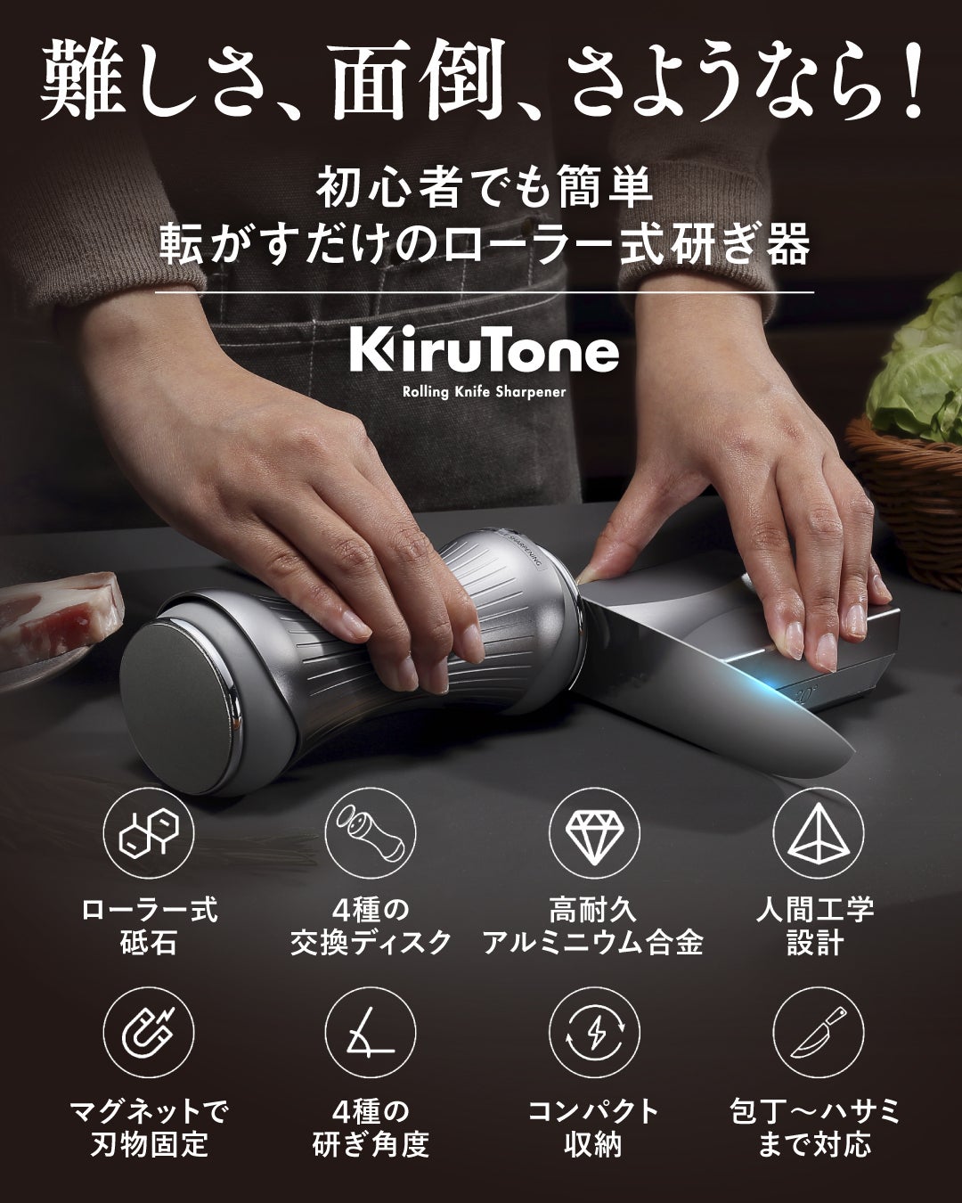 【KiruTone】は砥石が付いたローラーを刃物に当てて転がすだけで、素人でもプロが研ぎ直したような切れ味を取りもどせる画期的な砥石です。