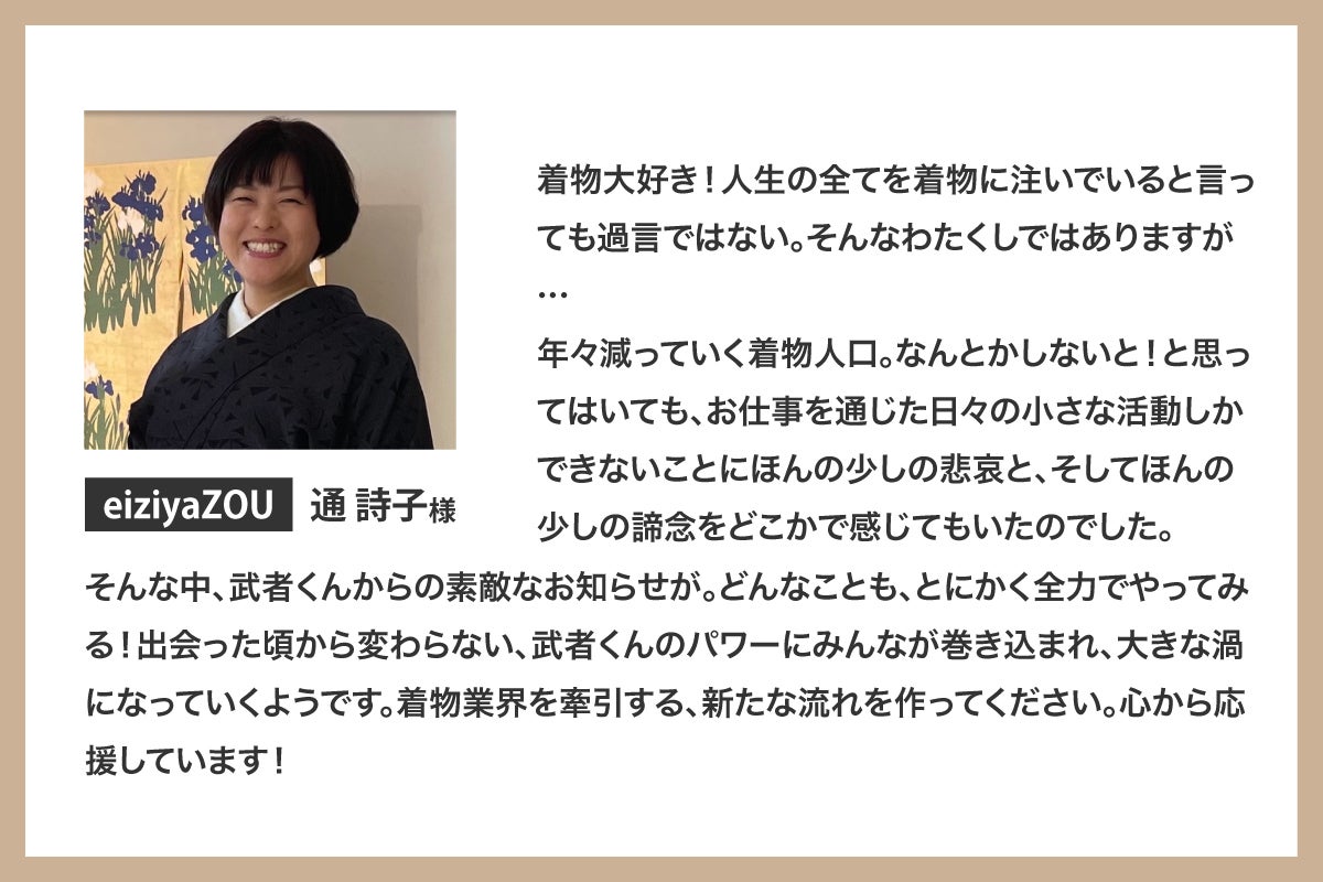 祖父の代から積み重ねてきた着物への愛と技術を、私はこれからも守り、さらに発展させていきたいと思っています。