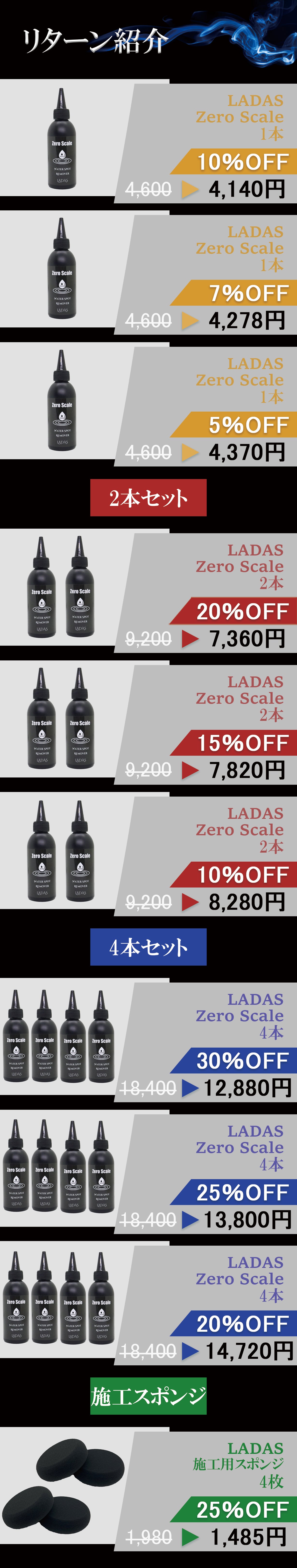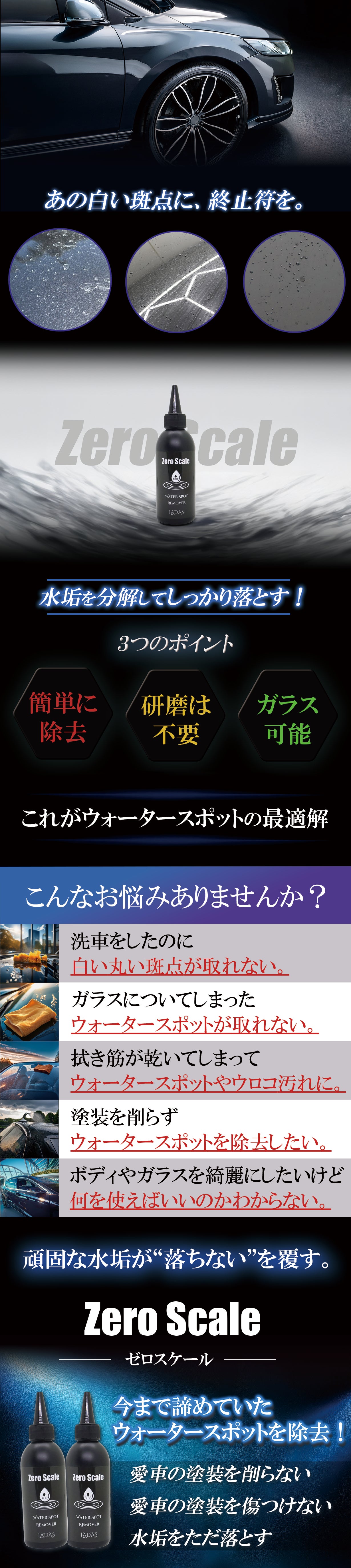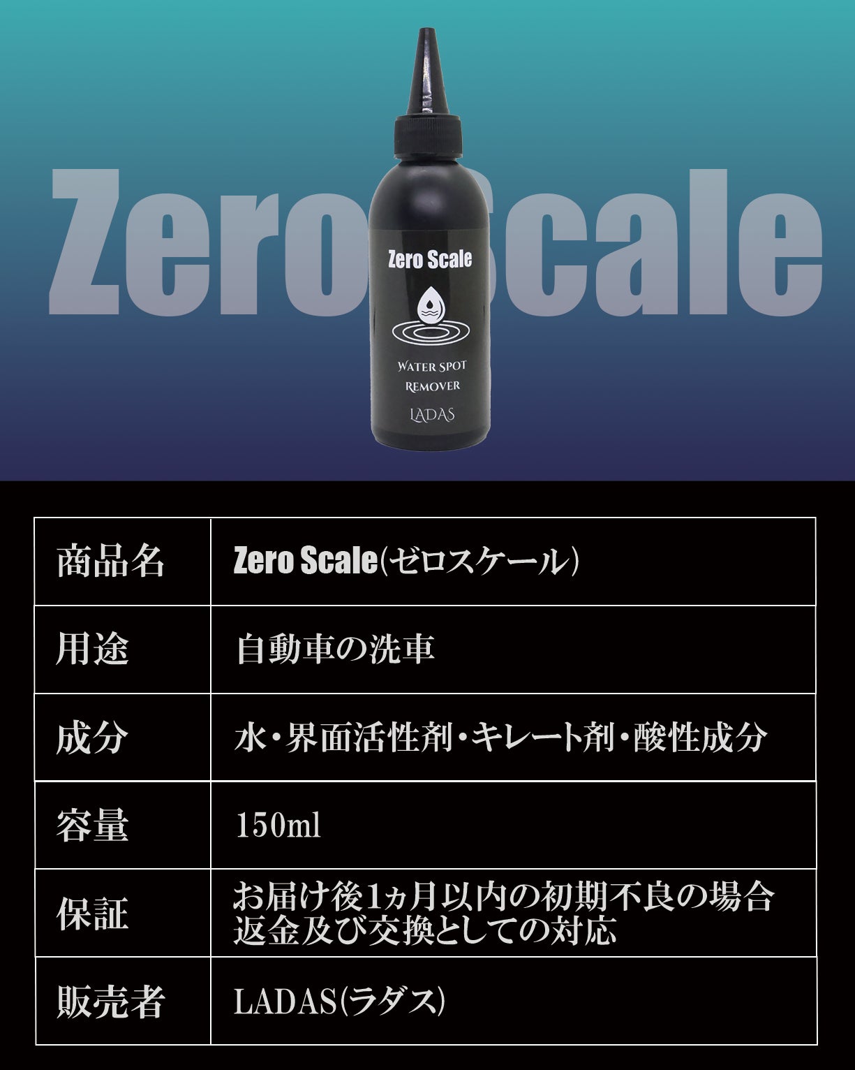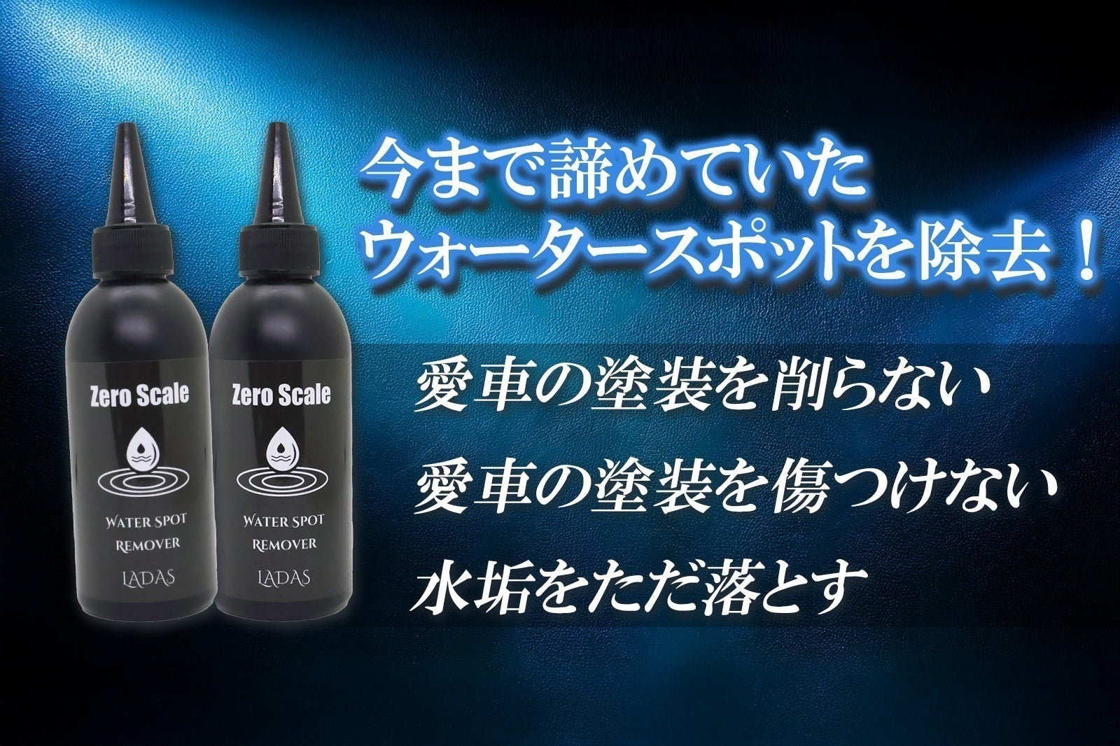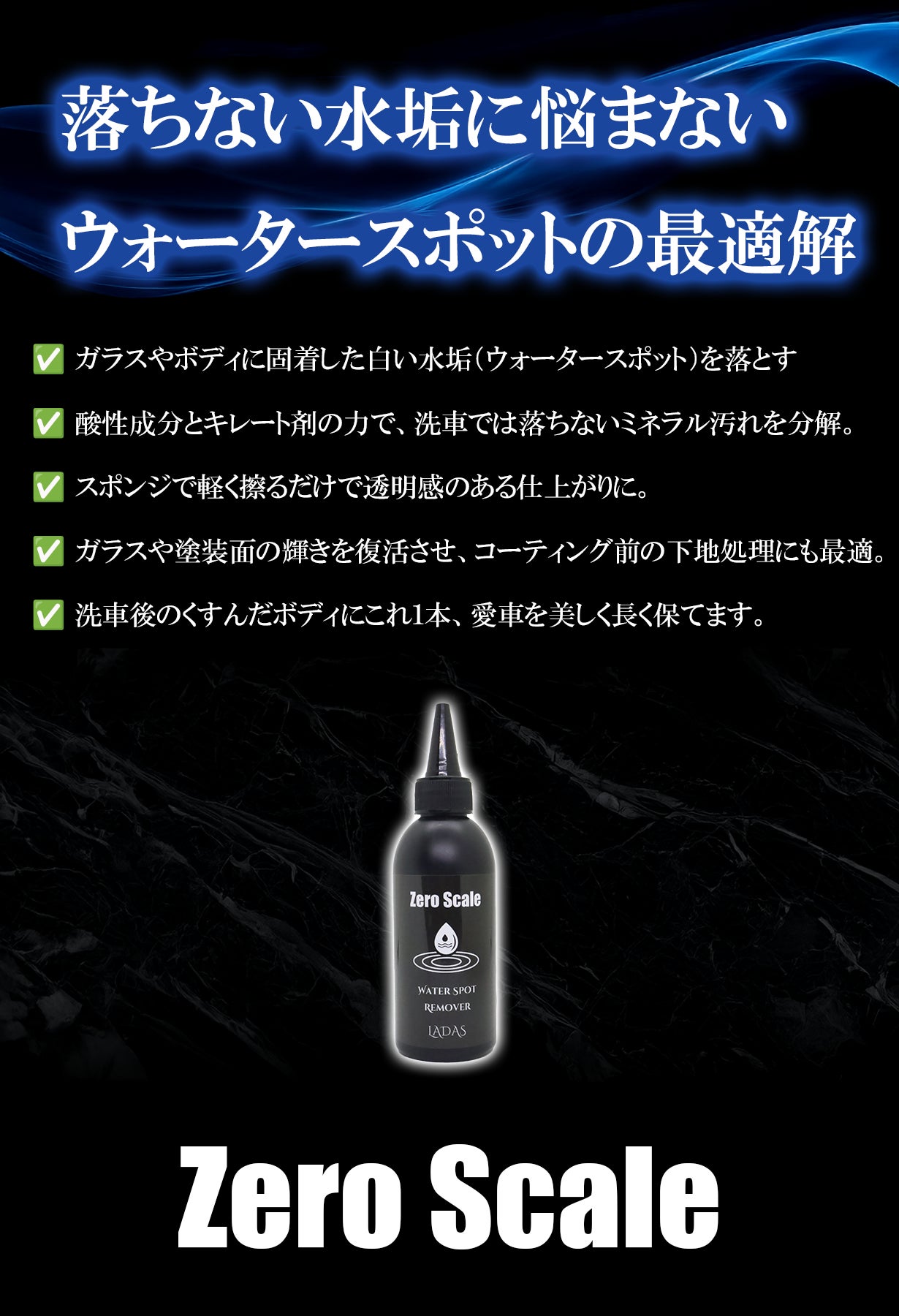 LADASウォータースポットリムーバーは、独自の「Zero Scale」処方により酸とキレートが同時に作用。