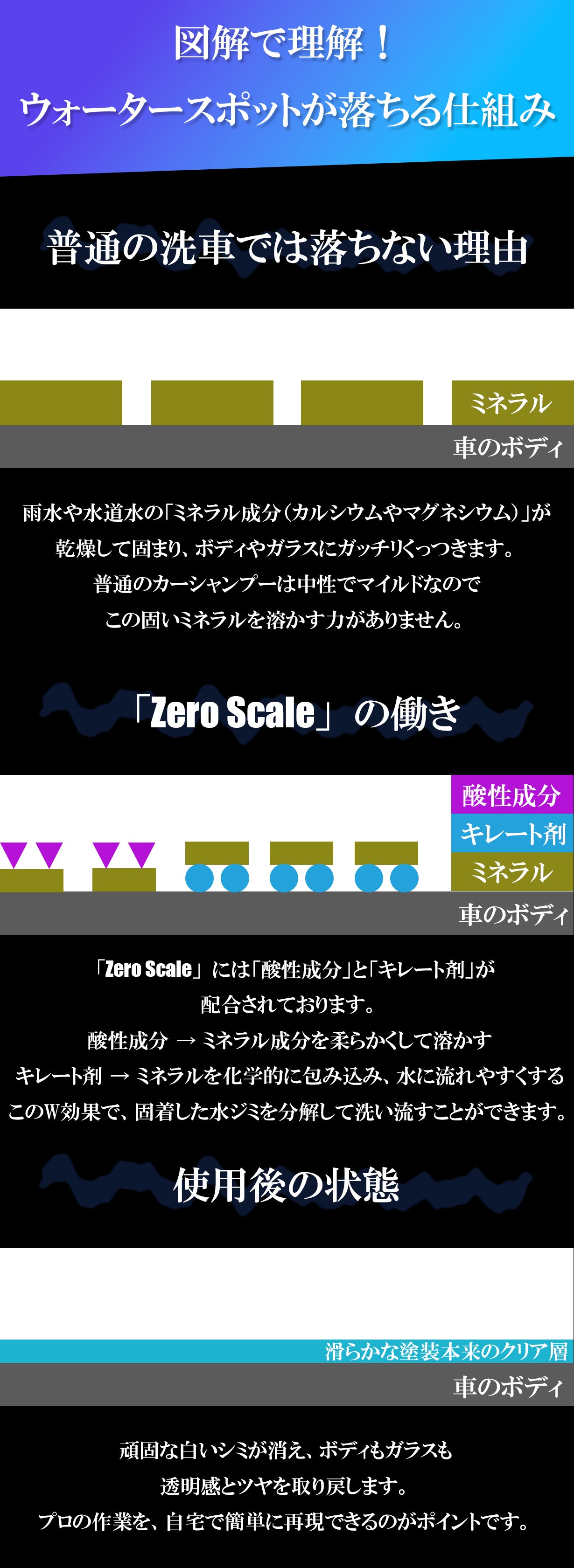固着したミネラルを根本から分解し、ボディ本来の艶やかで滑らかな塗装面を瞬時に取り戻します。
