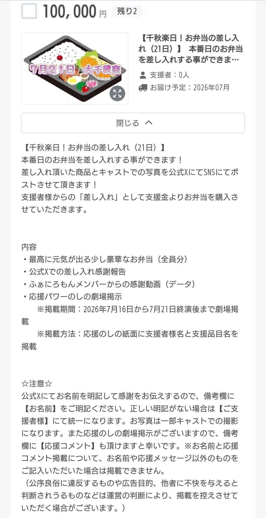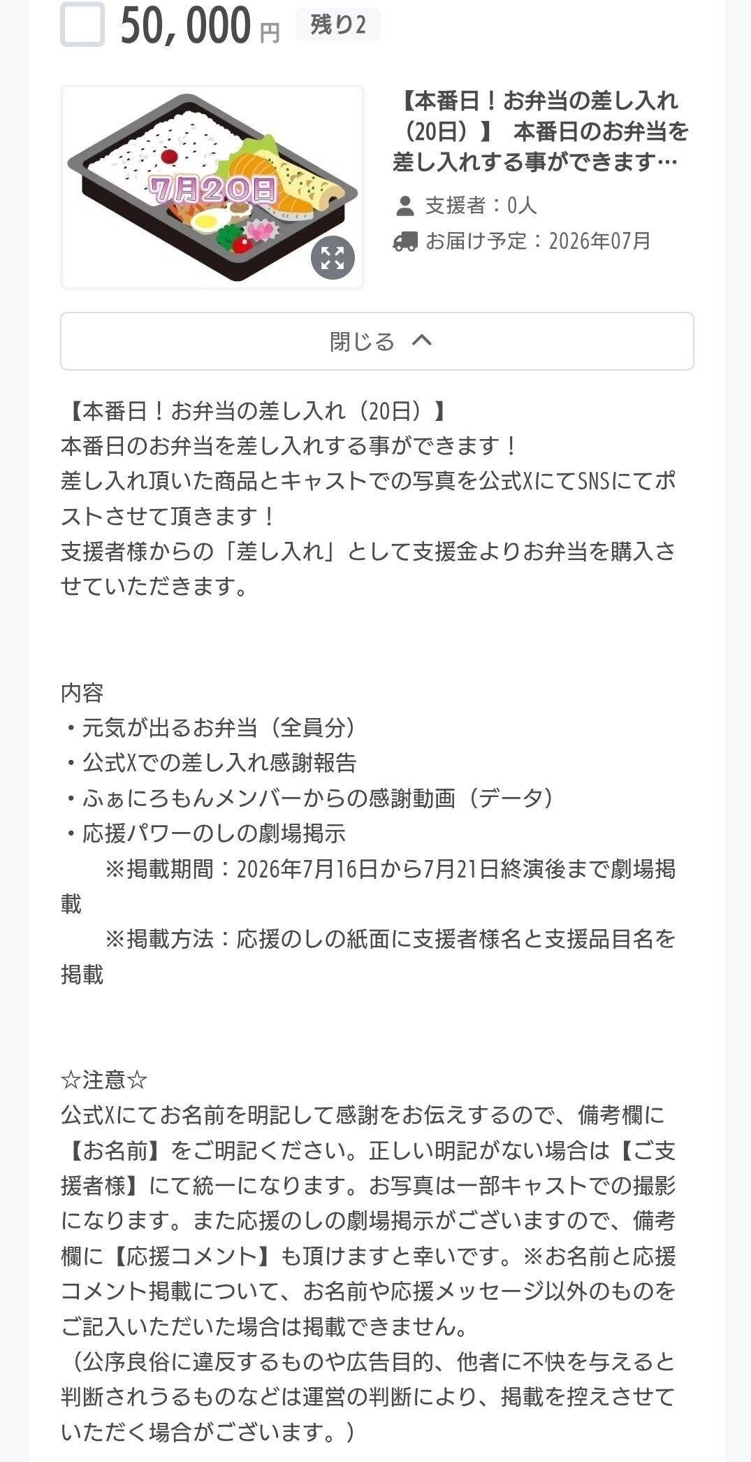 ⚠ 本番日のお昼のお弁当と夜のお弁当の『1日限定2支援』‼