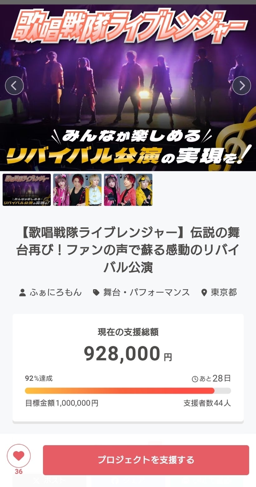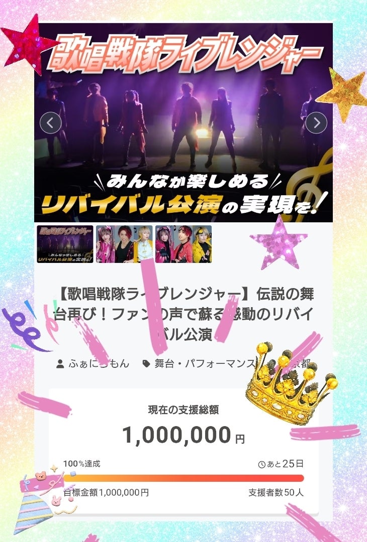 皆のもの様!活動報告担当ふぁにろもんマスコットキャラクター『ふぁにー』でし昨日は100%達成本当にありがとうございましたでし!!本日からクラファンもいよいよ折り返しでし! 昨日は号外を出してふぁにろもんの三人とお祭り騒ぎしてて忘れてしまったでしが……!!今日から最初から公開されていた【オリジナルリターン】たちのご紹介をしていくでしよ!!まずご紹介するのは1番人気の【ゲネプロ観劇チケット】https://camp-fire.jp/projects/915456/backers/new?id=1612509↑↑こちらからご支援可能↑↑7月16日、17日におこなれわれる『歌唱戦隊ライブレンジャーリバイバル』のゲネプロ(本番直前最後のリハーサル、通し稽古)を観劇できる特別なチケットで誰よりも早く作品をみれるチャンス!!!本番とはまた違った緊張感も味わえちゃうかも?!ライブレンジャーでは『初めてのゲネプロ公開‼レアなチケットを是非ゲットしてくださいませでし!!!⚠16日がA班、17日がB班となりますでし!!⚠どちらの班を観劇するかは『キャスト出演班公開後に選択』可能⚠『1支援』毎に『1公演』観劇可能なので、両班観劇希望の場合は『2支援が必要』となりますでし(限定数設定のあるリターンは複数同時支援が出来ません)(別のリターンと同時支援は可能です)⚠お席はご支援者様専用エリア内で『ランダム指定』となりますでし⚠備考欄に必ず『お名前』のご入力をお願いしますでしあとのこり22!!枠先着順でしよ!!この機会を逃さないでほしいでし!!!では!!次の紹介はなんでしかな?!お楽しみにでし!!!ほな!!!ふぁにー