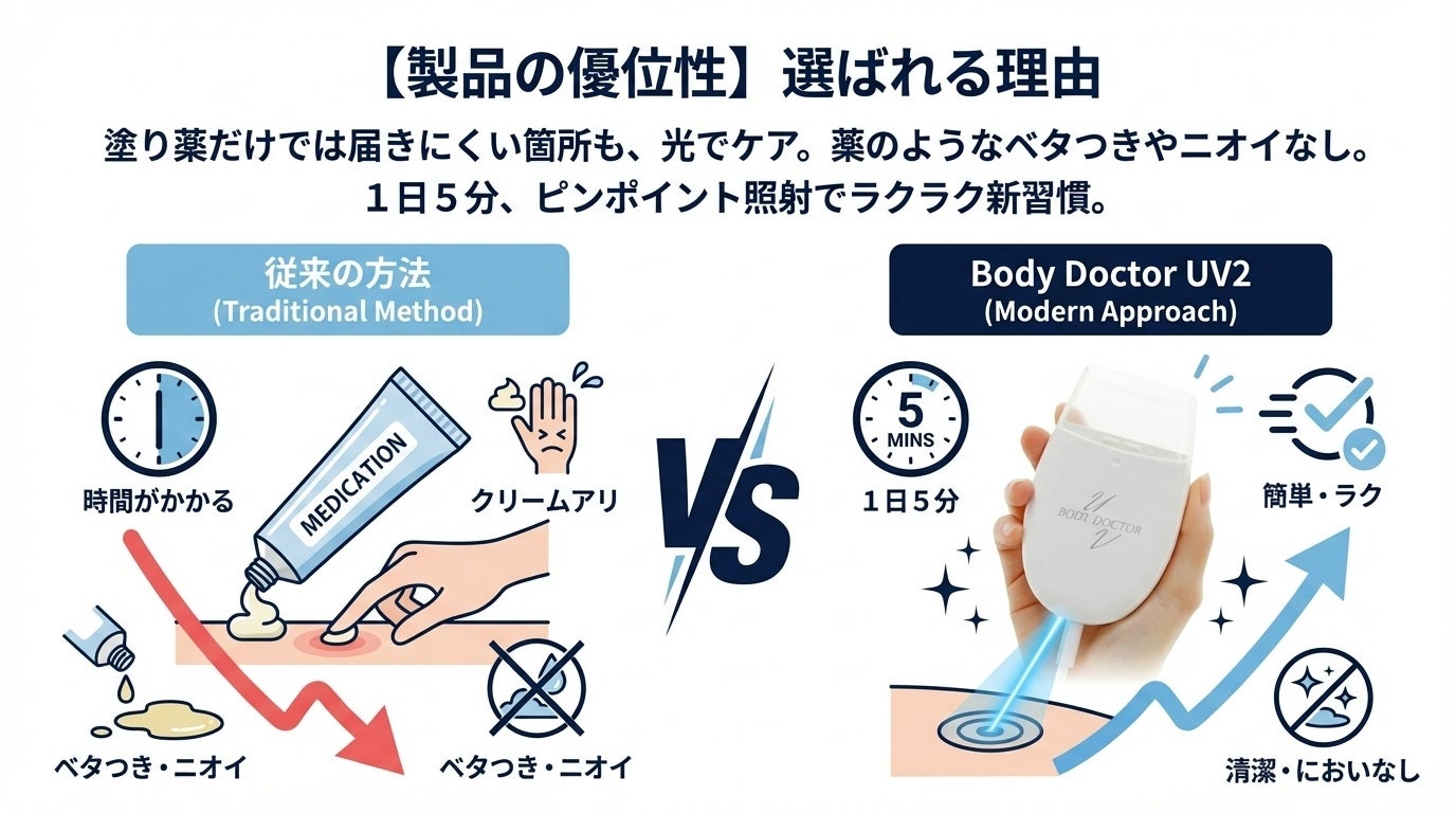 「気になった今の自分」にちょうど合う、続けやすさと安心感のバランスを大切にしました。その考え方から生まれたのが、ボディードクターUV 2です。
