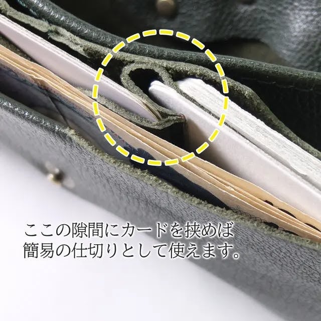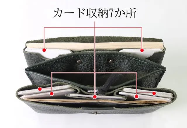 真ん中のカード入れの隙間にカードが入ります。通常は5か所のカード入れで(23枚)で十分かと思います。キャッシュレス派だから、お札はあまり持たないけど、カードは20枚以上持ち歩く・・・なんて方にもお勧めのオールマイティーに対応できる財布です。