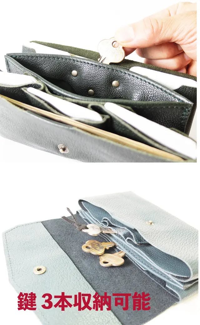 お札を分けたい、レシートは別に持ちたい。という方も多いはず。2か所のポケットを確保。お札はもちろんレシート、カードを入れるなど使い方は自由自在。大きく開く小銭入れを真ん中に確保。こちらには隠しマグネットを装着。見た目もシンプルながら機能性も抜群。開いたとたんに小銭がこぼれるなんてことはありません。カード入れも5か所+2か所の7か所を確保。キーポケットも3か所作りました。そこからは試作を作りミリ単位の調整を繰り返し完成しました。