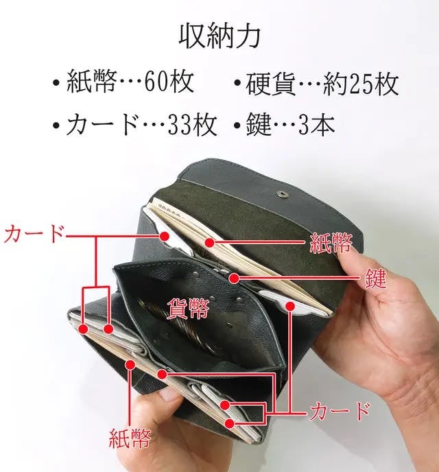 こんなに入ります!お札60枚、カード33枚 コイン25枚 鍵3個そんなには入れないけれど、いざという時に入る財布は余裕があります。