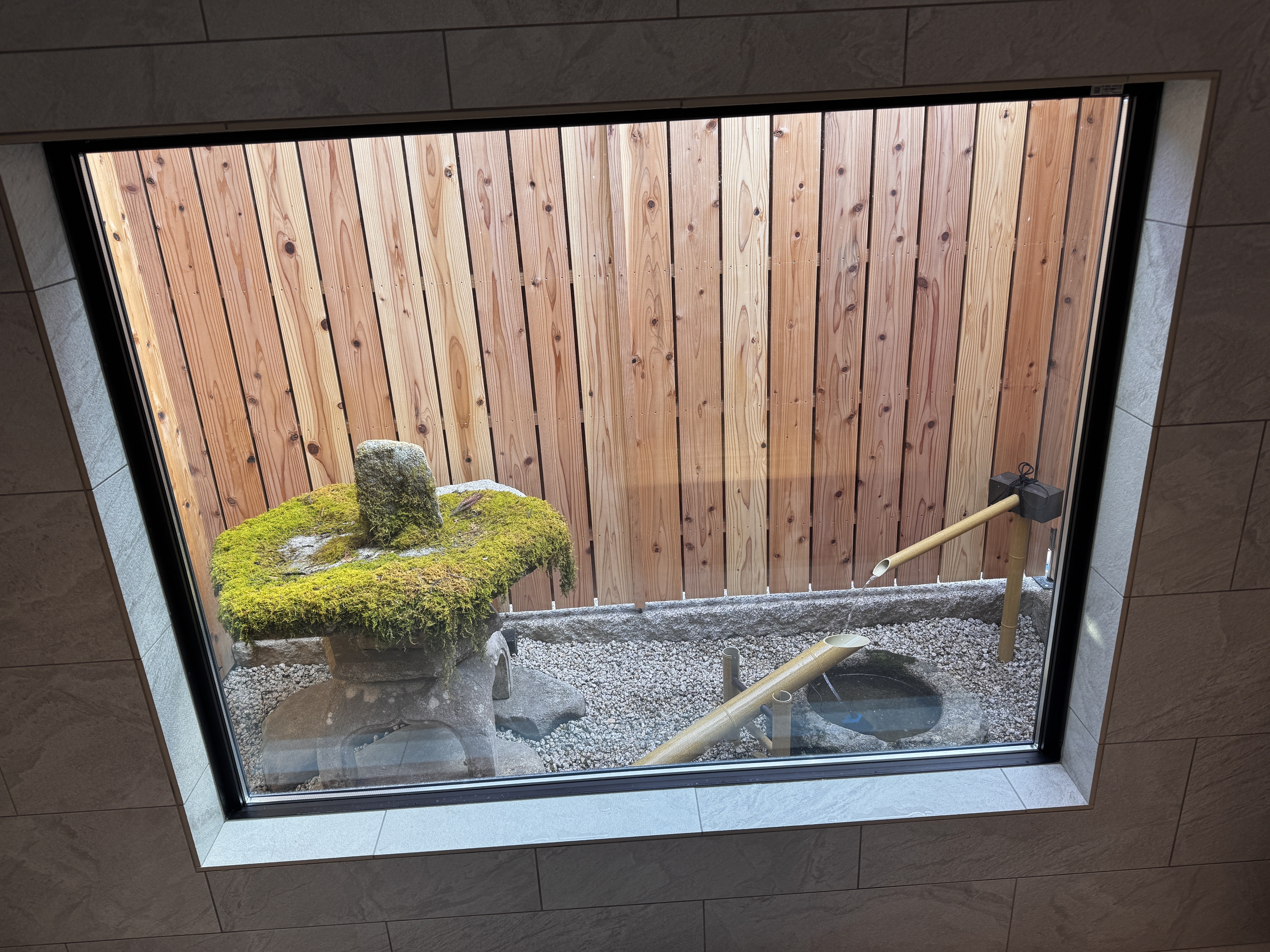 お風呂から眺める坪庭には「獅子落し」を設置いたしました。