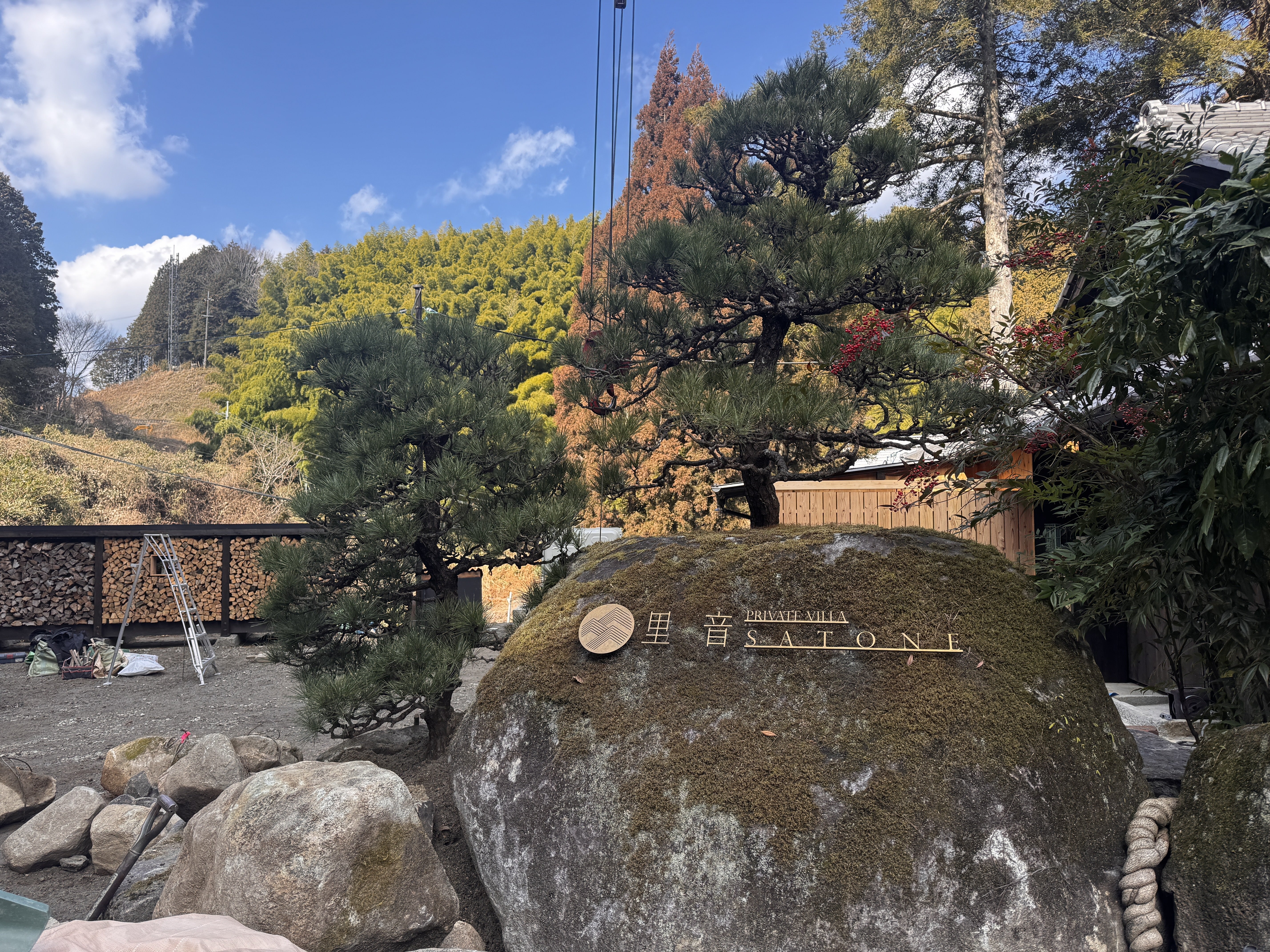 遠路はるばる関東から、二本一組の松を運び入れ、植樹していただきました。堂々と佇むその姿は、「里音」の入口看板をいっそう引き立て、訪れる人を静かに迎え入れてくれています。この場所に流れる時間とともに、数百年先の未来へと受け継がれていく庭に想いを託し、造園の匠の手によって、後世に残る庭づくりが今、ここから始まっています。