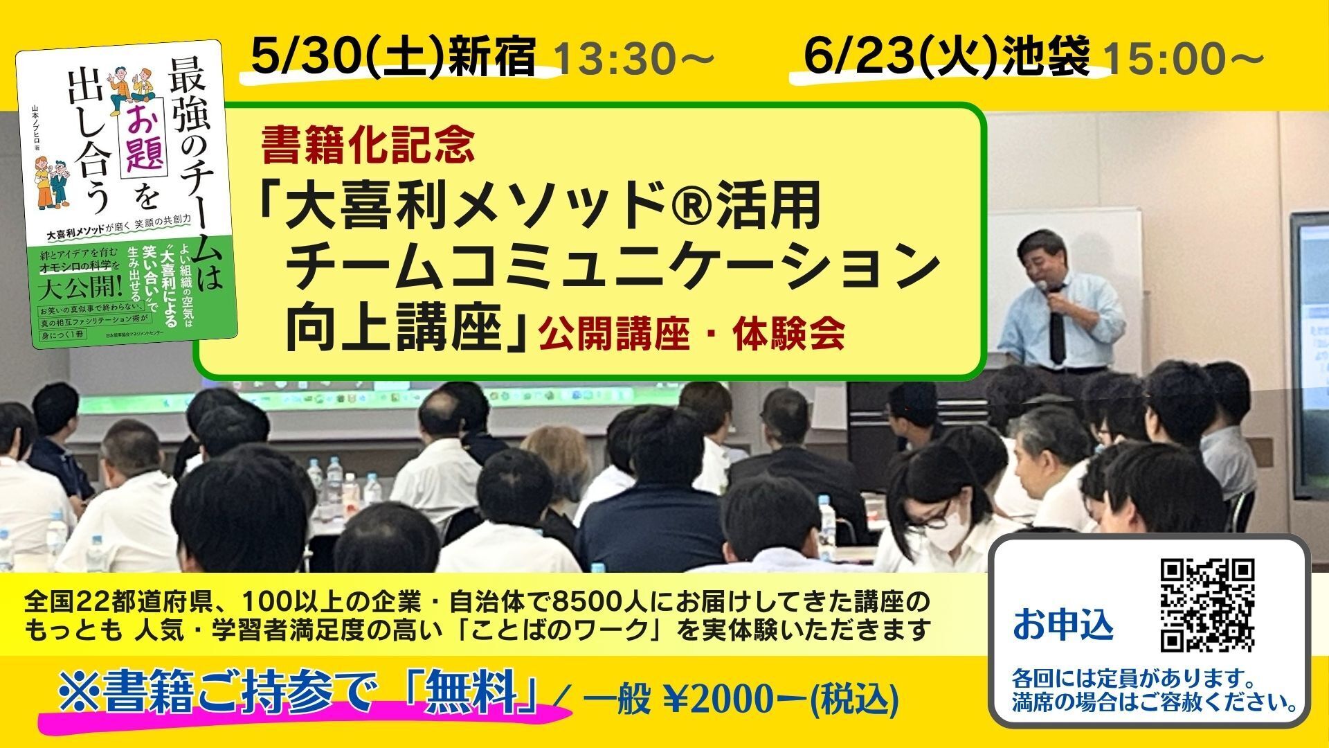 2026/04/16 14:01ご支援いただいた皆さまへの「お知らせ」です!みなさまからお預かりしたご支援金を、大喜利メソッド®を、この本を、皆様に広げることに費やすために!東京にて、5/30(土)新宿 13:30〜 6/23(火)池袋 15:00~ の2日程で出版記念 公開講座を開催します。全国ツアーは叶いませんでしたが、みなさまからの熱い応援・声援に、最大限に応えるため、活用させていただくための開催です。 ・リターン「全国ツアーご受講券」にエントリいただいた皆様、 もちろん無料ご参加できます!ご招待致します! ・共催パートナーとして「◯名分のご招待券」の権利を お持ちの皆さま、もちろんご招待を行使いただけます!なお、加えまして、皆様への感謝の証としまして ・書籍『最強のチームはお題を出し合う』をお持ちの 読者の方! (もちろん本プロジェクトのリターンでお届けの皆様も) 書籍をご持参いただいた方は 全員 ¥0- にて無料ご受講いただけます。_________▼ 開催日時・会場 ▼週末・平日の2日程での開催です。 __【新宿 の 土曜日】__2026/5/30(土) 13:30〜15:30 ※30分前 開場野村不動産新宿南口ビル 4Fセミナールーム (JR「新宿駅」南口より徒歩5分)__ 【池袋 の 火曜日】__2026/6/23(火) 15:00〜16:50頃 ※30分前 開場としま区民センター 4F 会議室403(各線「池袋駅」東口より徒歩7分)______________________ご参加方法 : リターンの行使について・ご招待券 のリターン権利をお持ちの皆さまあす 2026/04/17 以降、みなさまに個別にご参加券の行使・参加日時などのご希望についてお伺いいたします。ご回答を何卒よろしくお願い致します!・一般の皆さまのお誘い、 書籍1冊をお持ちの 読者 の皆さま本をお用いただければ、無料で!ご参加いただけますので、ぜひぜひ!以下フォームからエントリくださいませ。【ご参加お申込みフォーム】 ※一般https://forms.gle/EiXYXrZ1cE5yFHGt6_____________________________当日の「公開講座」内容について企業や自治体・行政機関で人気の「組織内コミュニケーション向上講座」の内容を、ほぼ、そのままに!書籍のなかで、特に強く取り上げている「笑顔の共創力」についてよりフォーカスした内容を、公開講座向けの特別プログラム 【大喜利体験で学ぶ・感じる・考える 「オモシロの力」とチームコミュニケーション】と題して開講いたします。 ・参加のハードルを下げるための導入・アイスブレイク から ・人気の大喜利ワーク・ことばあそびの実体験、 ・体験を学びに変え、定着を何倍にもする 「オモシロの科学」の座学( + 本に書きそびれている、でも「学びの場」では要点となる、 「オモシロの正体を暴く講義」も?!)などを、しっかりお届けいたします。一連の流れをすべてご覧いただき、何より皆さまに「お楽しみ」いただきたいです。そして何より、このクラウドファンディングにご支援をいただいた皆様に、対面しての「ありがとうの気持ち」をお伝えする場をご用意できた事をほんとうに嬉しく思っています。土曜の昼の新宿と、火曜の午後からの池袋と、ご都合のよきほうへのご参加を、ぜひぜひ!何卒!よろしくお願い致します。 もっと見る
