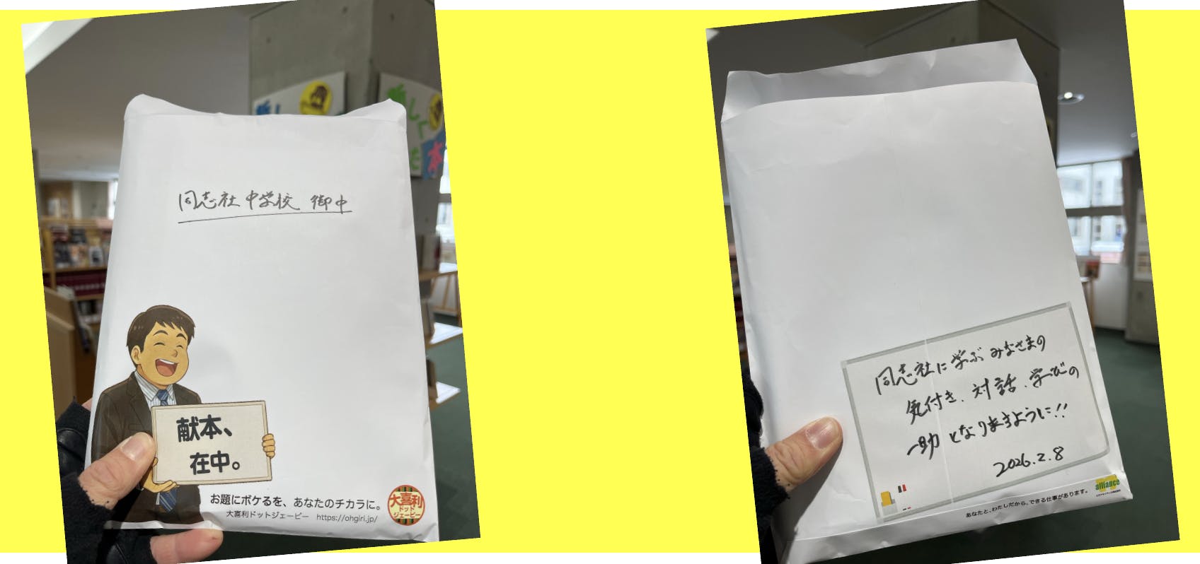 学内の様子の写真がなくてごめんなさい!ですが、教育イベントで京都の校舎にお伺いする機会をいただき、ご担当者様へ直接お手渡しすることができました。
