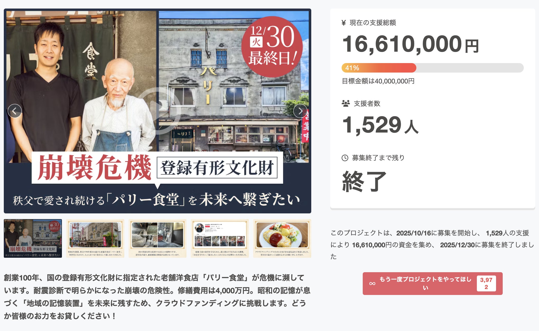 2026/02/19 20:00皆さま、お久しぶりです。このたび、パリー食堂のクラウドファンディングは無事に終了いたしました。第一弾、第二弾を通して支えてくださったすべての皆さまへ、心から御礼申し上げます。第一弾:1,529名第二弾:593名合計 2,122名 の皆さまにご支援いただきました。沖縄から北海道まで、本当に全国各地からご支援をいただけたことを、誇りに思います。秩父の一食堂に、これほど多くの想いが集まったこと。これは数字以上の奇跡です。今回のプロジェクトは、「耐震工事」という未来を守るための挑戦です。皆さまから頂戴いたしました大切な資金は、責任を持って、すべて耐震工事費用に充てさせていただきます。専用口座にて管理し、透明性を持って進めてまいります。ここがゴールではありません。ここからが、本当のスタートです。工事の進捗、設計の内容、基礎補強の詳細など、引き続き正直にご報告してまいります。2,122名の想いを背負い、必ず未来へつなげます。本当に、本当にありがとうございました。 もっと見る