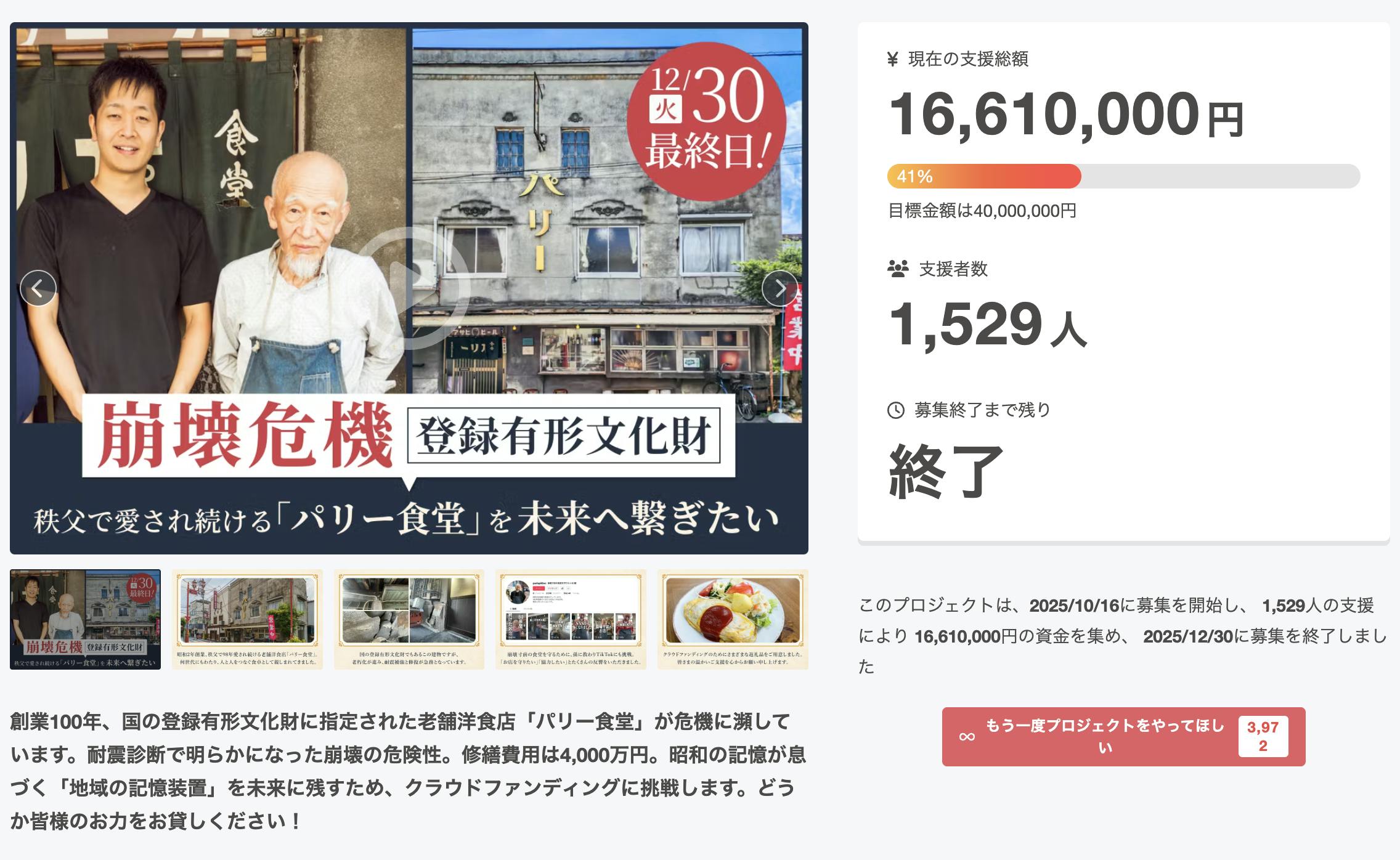第二弾の内容は、第一弾と大きく変わるものではありません。それでも、この建物を、パリー食堂を、次の世代へ残すために今できるすべてを出し切りたい。その覚悟のもともう一度、皆さまにお願いする決断をしました。どうか、この想いをご理解いただけましたら幸いです。