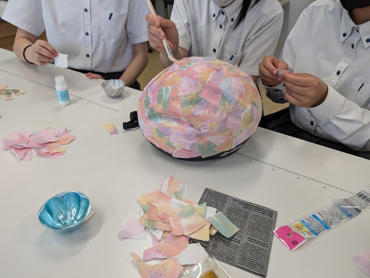 【中学生が「お譲りプロジェクト」のヘルメットや鞄をリメイクしている様子】