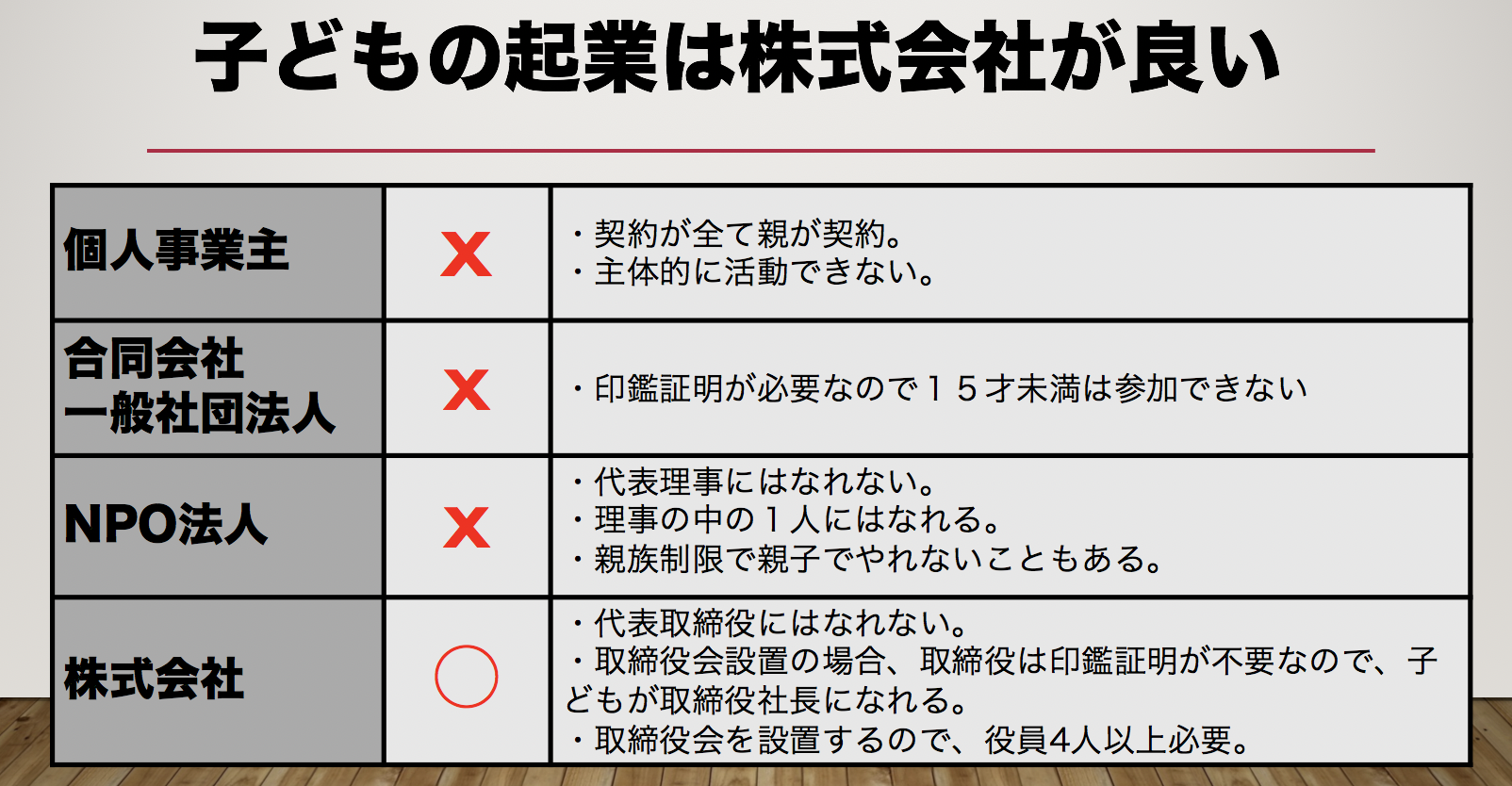 ②法人でも、合同会社や一般社団法人は、印鑑証明が必要になりますが、15歳未満は印鑑証明が取れないので、合同会社や一般社団法人では15歳未満の子どもは参加できません。