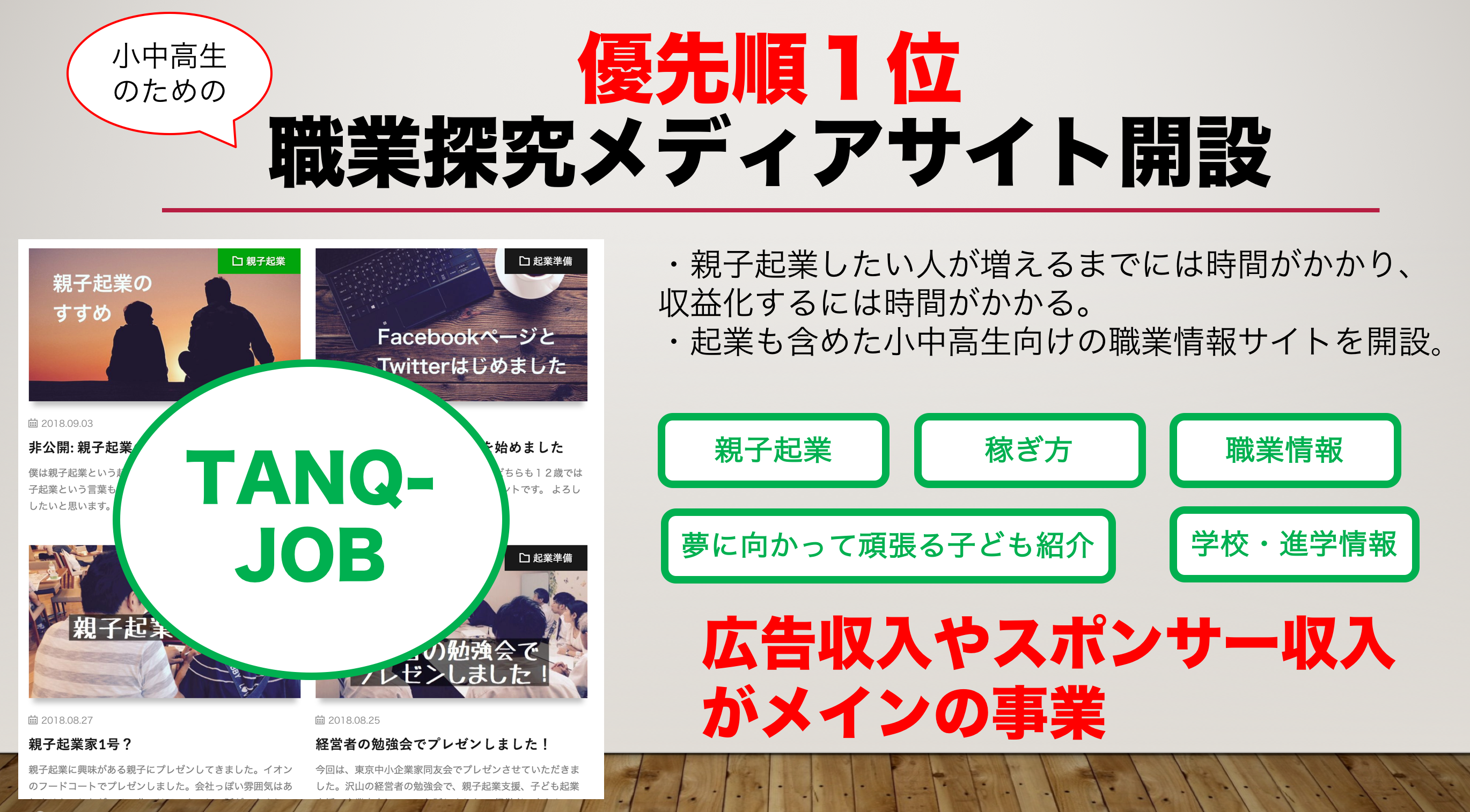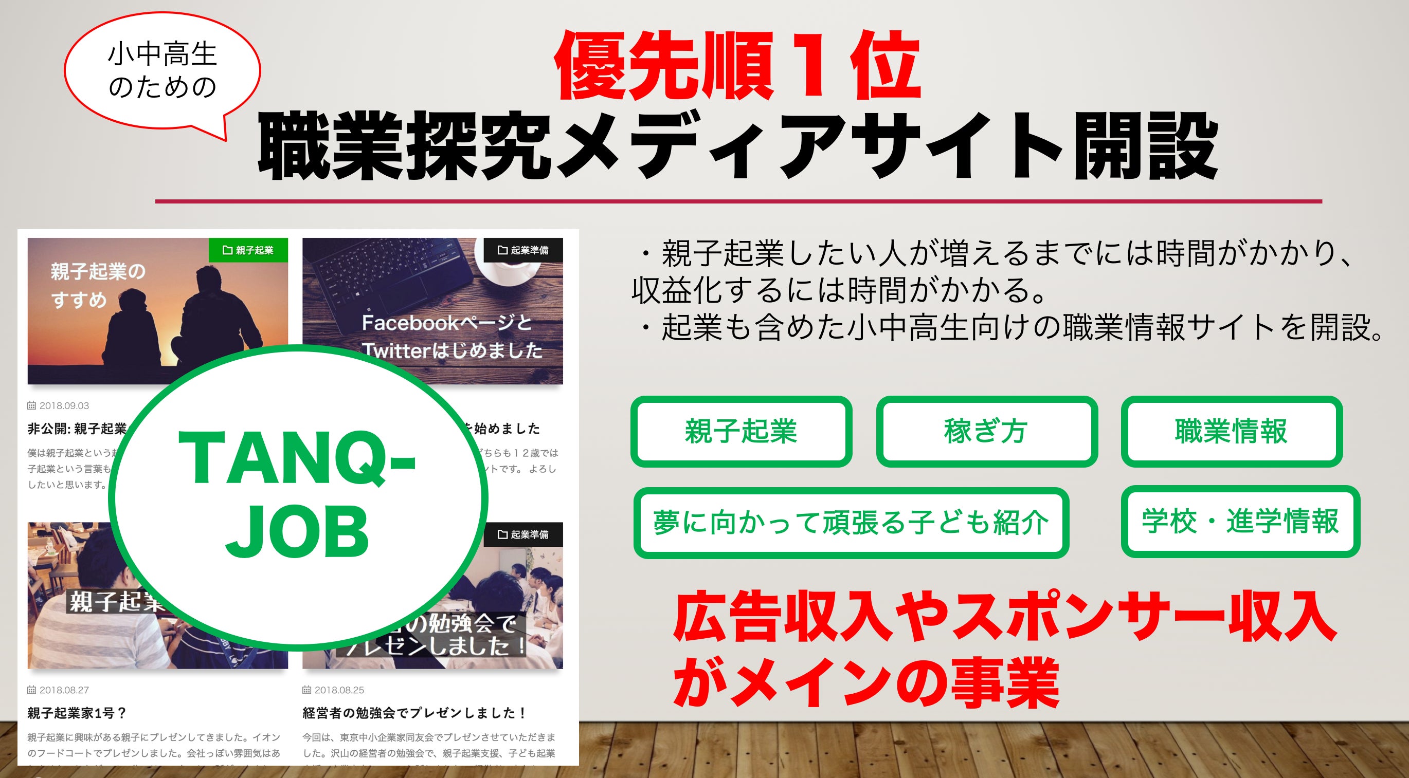 そこでまずは「小中高生のための職業探究ウェブメディア【TANQ-JOB】」という子どものための仕事情報サイトを立ち上げることを計画しました。親子起業や子どもの起業の情報はもちろんのこと、起業以外の働き方や仕事の情報発信、目標に向かって努力している子どもの紹介なども行います。広告収入やスポンサー収入がメインの事業になります。