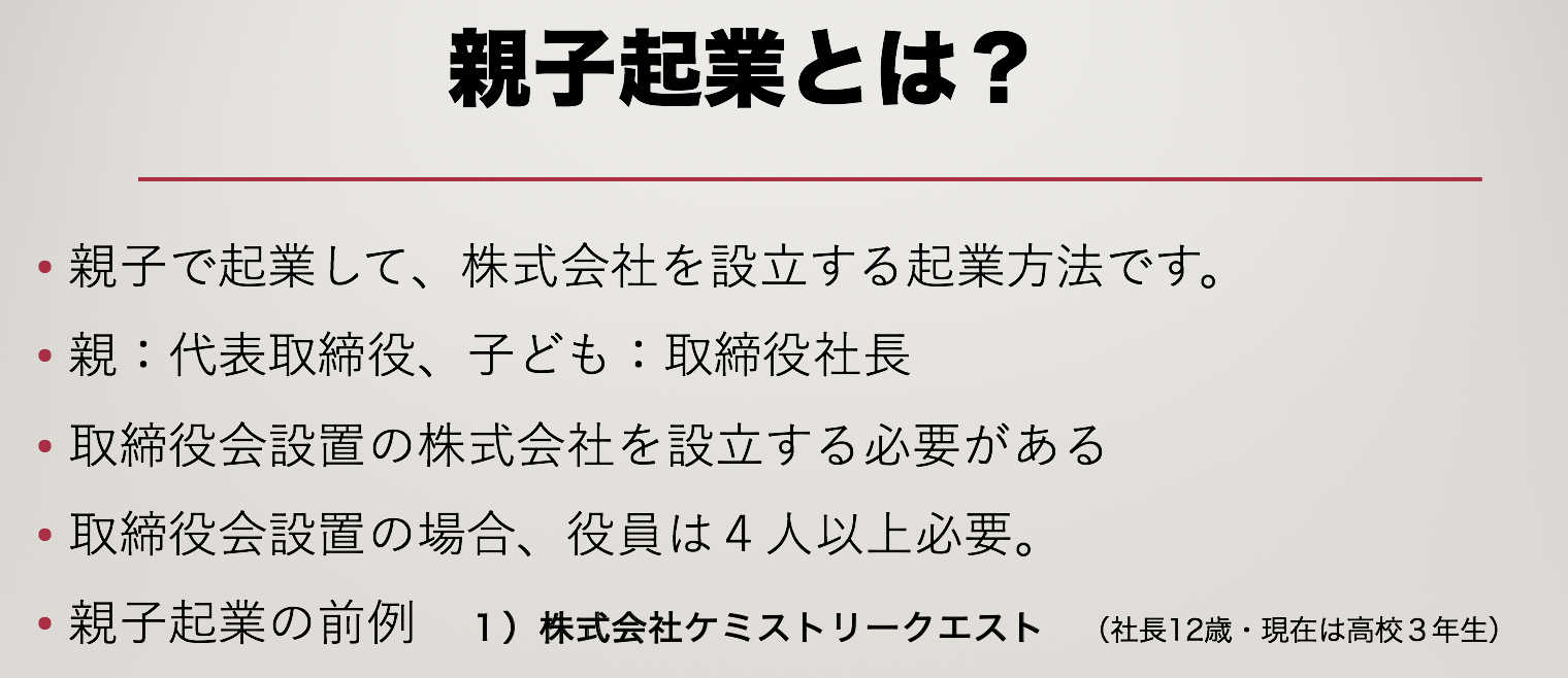 でも、大切なことはそこではありません。中学生になると親から習うことも少なくなっていきます。親がいなくても生きていけるのに、実際はお金がなくて親の下にいなければなりません。けれど、親子起業すると違います。メールの送り方やプレゼンの仕方、名刺交換の方法や、事業計画、資金調達など学校では学べないことを親から学ぶことができます。子どもにとって会社設立は未知の世界なので、親のことを尊敬できるようになります。