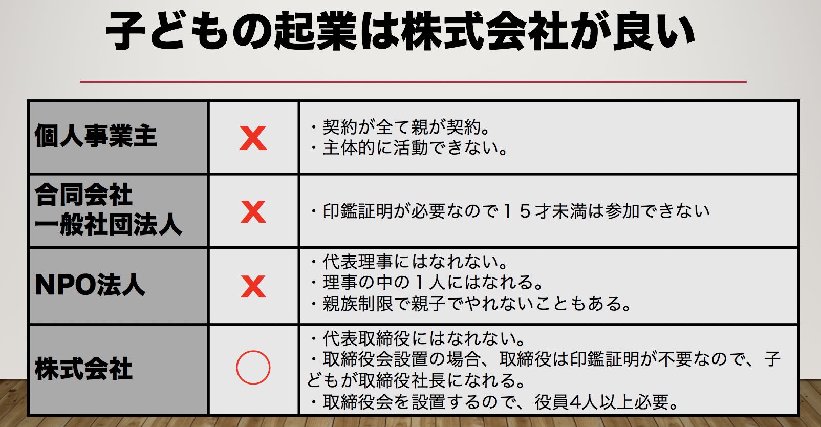 ①個人事業主は、仕事をする時の色々な契約が未成年だからできません。親の名前での契約になり、主体性を持って子どもが活動できません。よって、主体的に仕事をしたい場合は法人での活動が適しています。