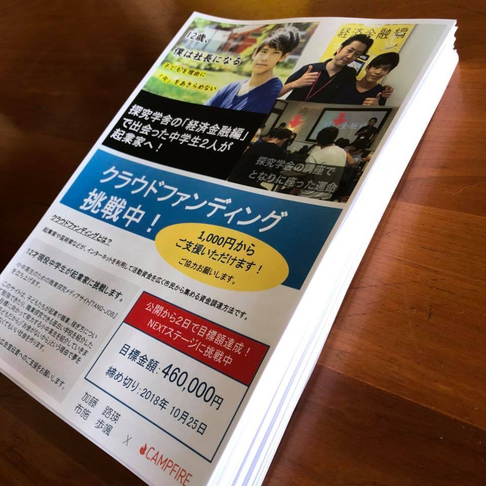 そこで、クラウドファンディング用のチラシを作りました。今回は、探究学舎の感謝祭で配ってくださるそうなので、探究学舎用のチラシにしてみました。250枚印刷しました。