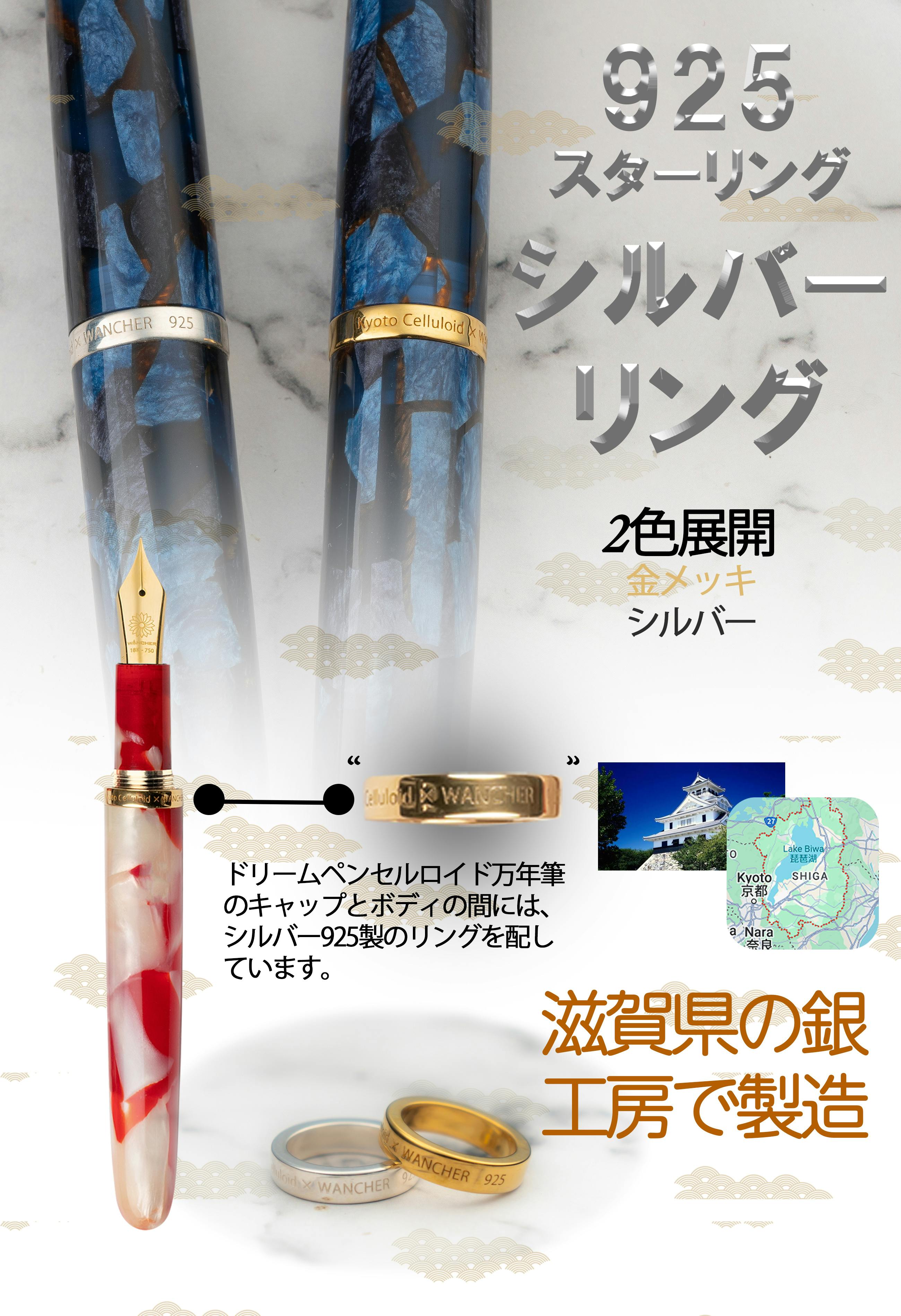 【ご使用上の注意】本製品はセルロイド素材を使用した万年筆です。セルロイドは美しい光沢と質感を持つ一方で、熱・火気・直射日光に弱く、可燃性のある素材です。そのため、高温多湿な場所や火気の近くでの使用・保管はお避けください。また、強い衝撃や落下、アルコールや薬品との接触により、変形・変色・破損の恐れがあります。長期間ご使用にならない場合は、インクを抜き、洗浄・乾燥したうえで、他の物と接触しない風通しの良い環境で保管してください。素材の特性をご理解のうえ、丁寧にお取り扱いくださいますようお願いいたします。