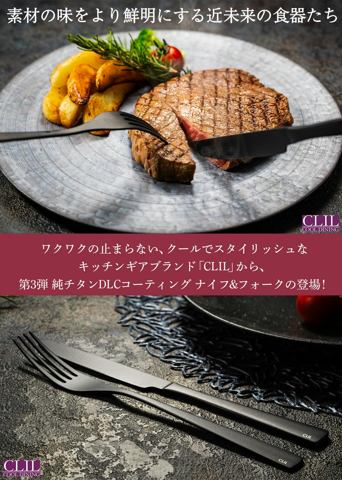 今回は、COOL DINING CLILから、第3弾 純チタンDLCコーティングの「ナイフ&フォーク」のご提案です。