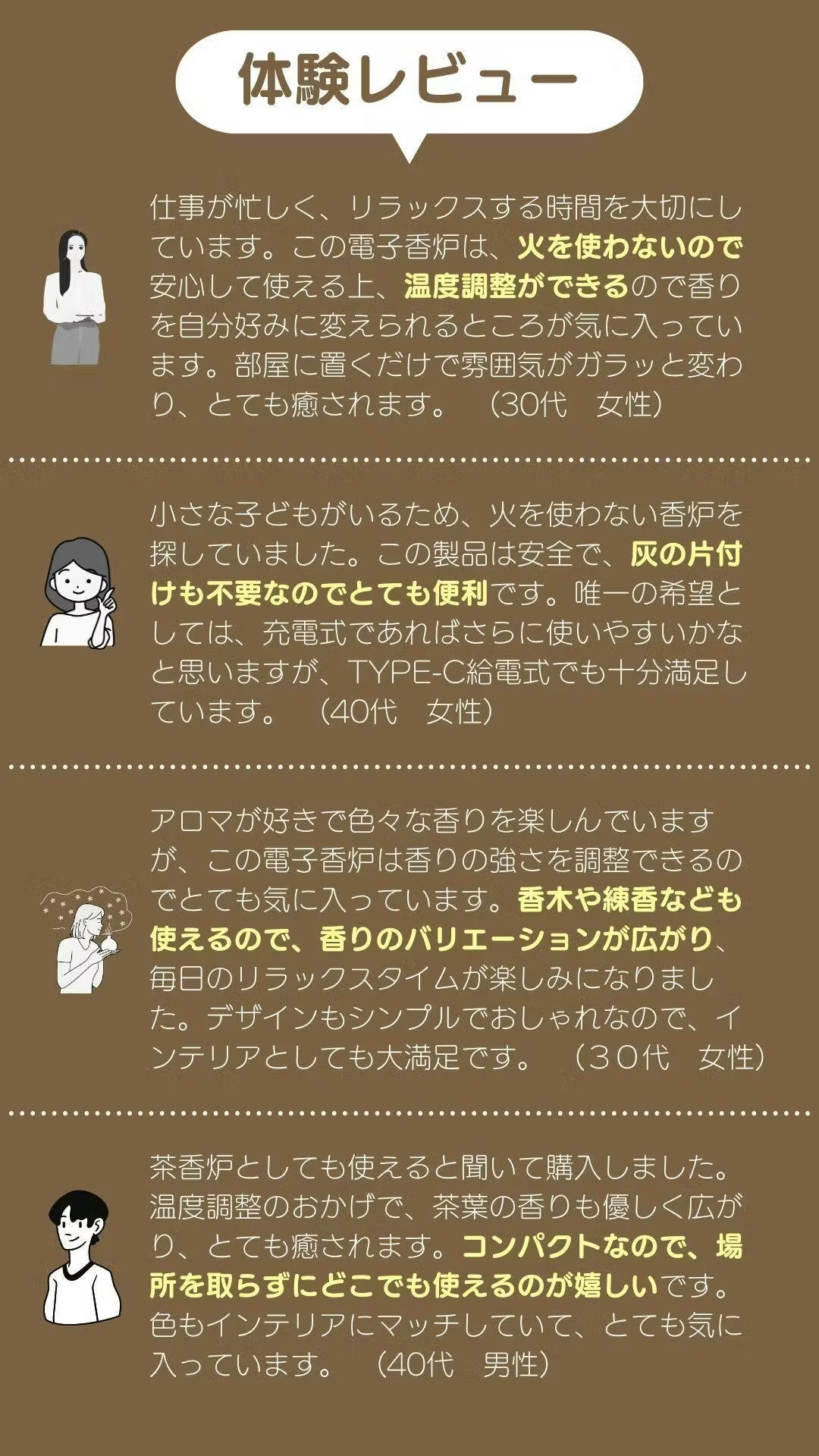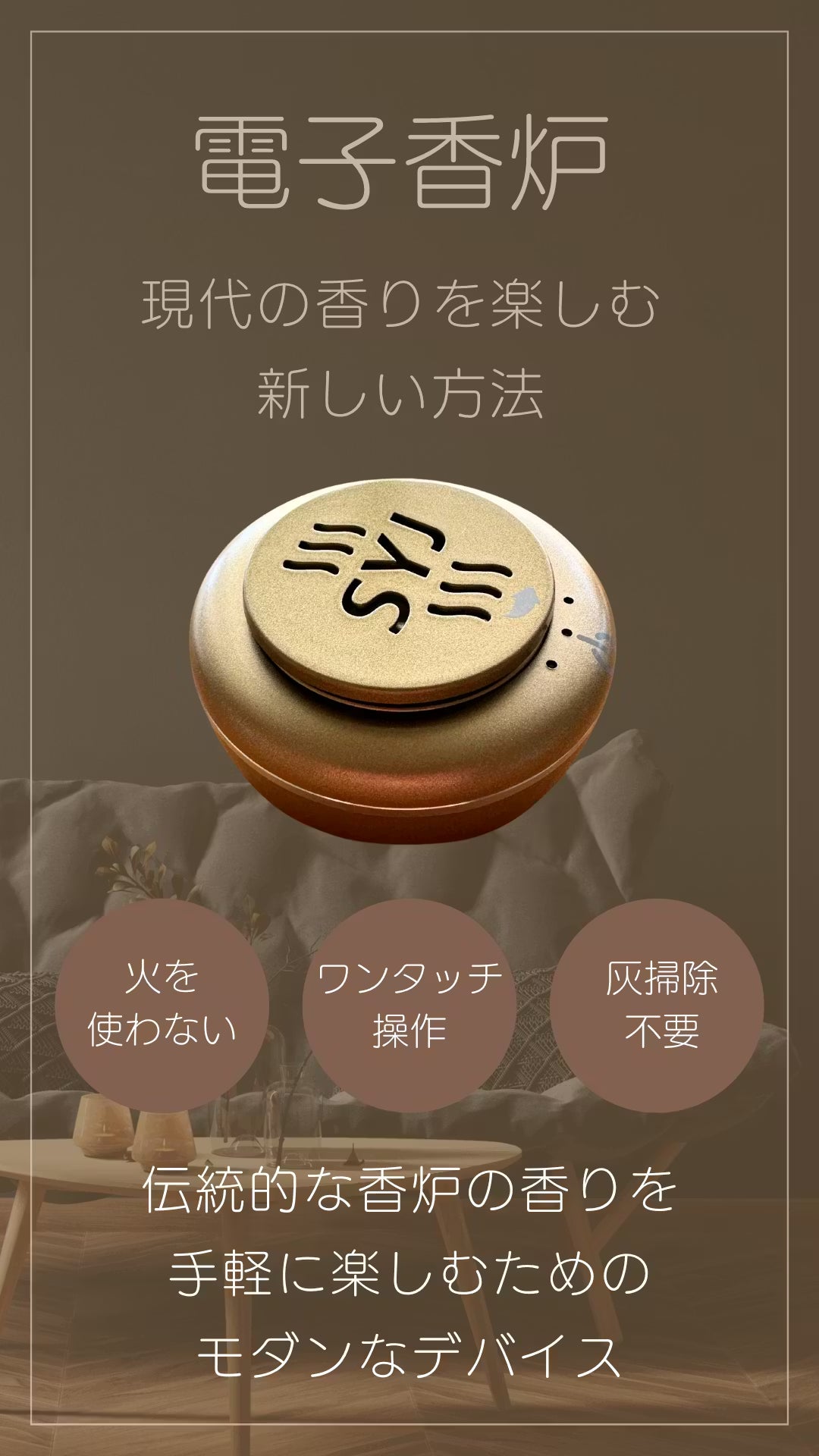 現代の生活は、テクノロジーの進化により便利になった反面、ストレスや忙しさが増えています。この電子香炉は、そうした忙しい日々の中でも、誰もが手軽に香りを楽しみ、リラックスできる時間を提供したいという思いから生まれました。