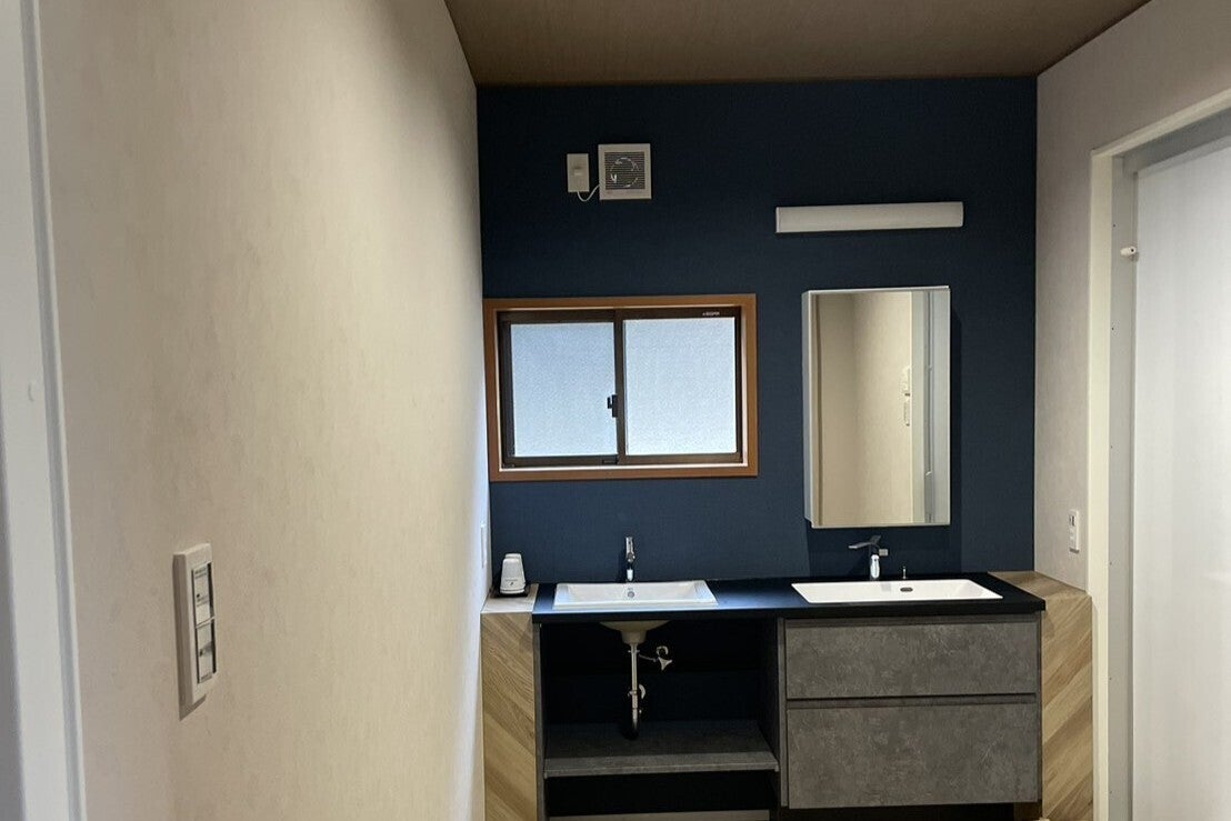 洗面台を2つ備えた、ゆとりのある洗面脱衣スペースです。