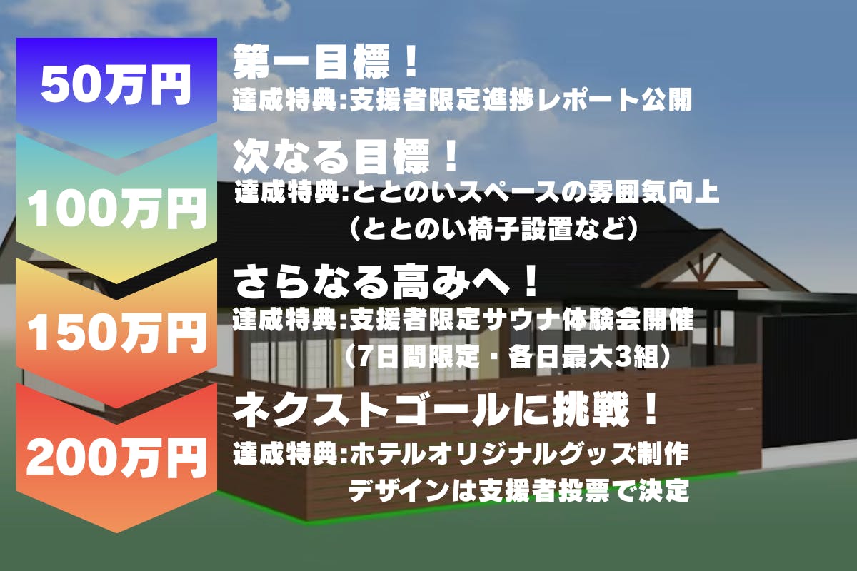 今回のクラウドファンディングは、サウナ建設費用の一部をご支援いただくためのものです。