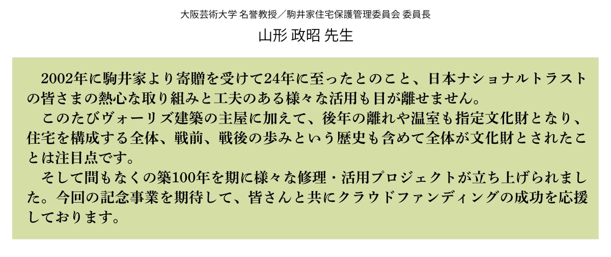 さて、本日は、ヴォーリズ建築研究の第一人者である山形政昭先生(大阪芸術大学名誉教授/駒井家住宅保護管理委員会委員長)より、今回のプロジェクトに対する応援メッセージをいただきましたのでご紹介します。