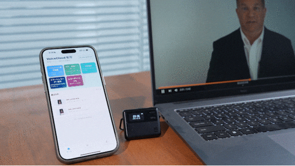 アプリには同時翻訳機能(聞き取り翻訳)も搭載。相手がしゃべっているときに話を精確に聞き取り、しゃべり終わったら設定済みの言語に翻訳しスマホ画面に表示されます。国際会議や講義、字幕のない外国語動画の視聴などに最適!