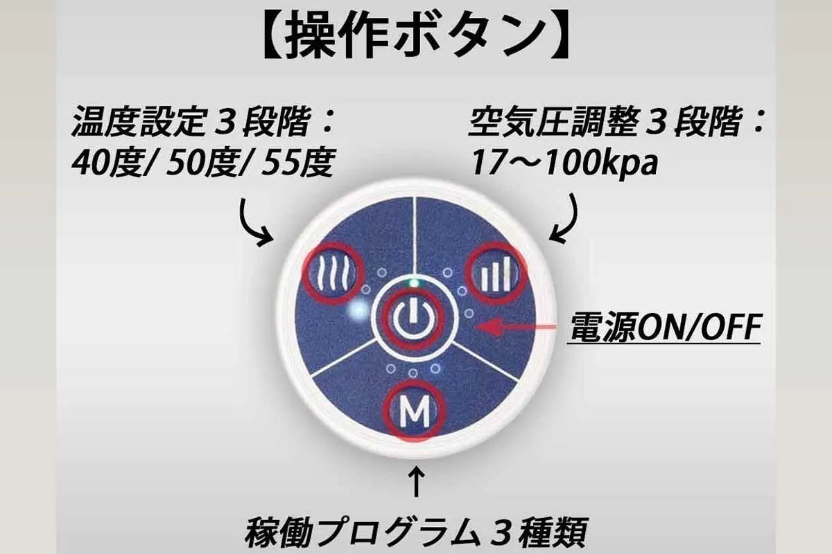 ふくらはぎと足裏部分を中心にエアーが足全体を包み込みます。寒い季節は温感もあります。