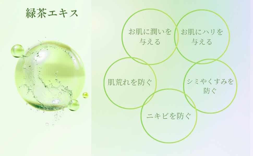 緑茶から抽出した緑茶エキスは、肌を健やかに整え、肌本来の力を引き出します。清潔で滑らかな肌へ導きます。日々の外的環境による肌ストレスに配慮し、やさしく肌を守ります。