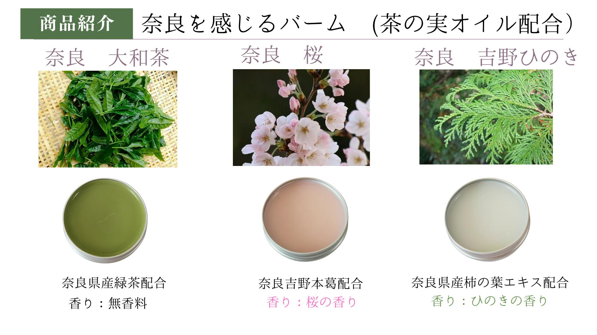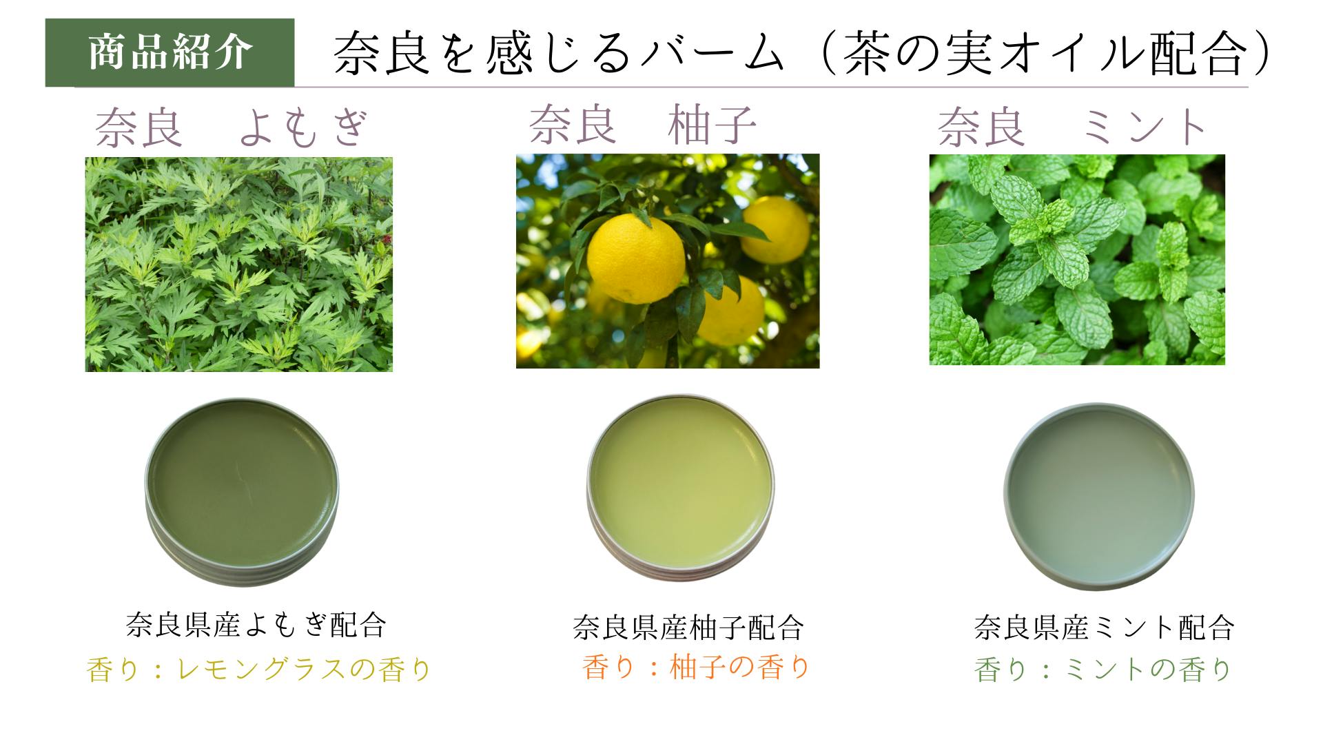 奈良や奥大和を感じるバーム(軟膏)です。山添村で栽培された柚子、よもぎ、ミント、緑茶です。奈良の思い出となるような商品を開発をしました。植物油から作った自然派バームですので安心してお使いいただけます。べたつかずさらっとお肌に馴染みます。また原材料には、山添村産の『茶の実オイル』を使用しています。