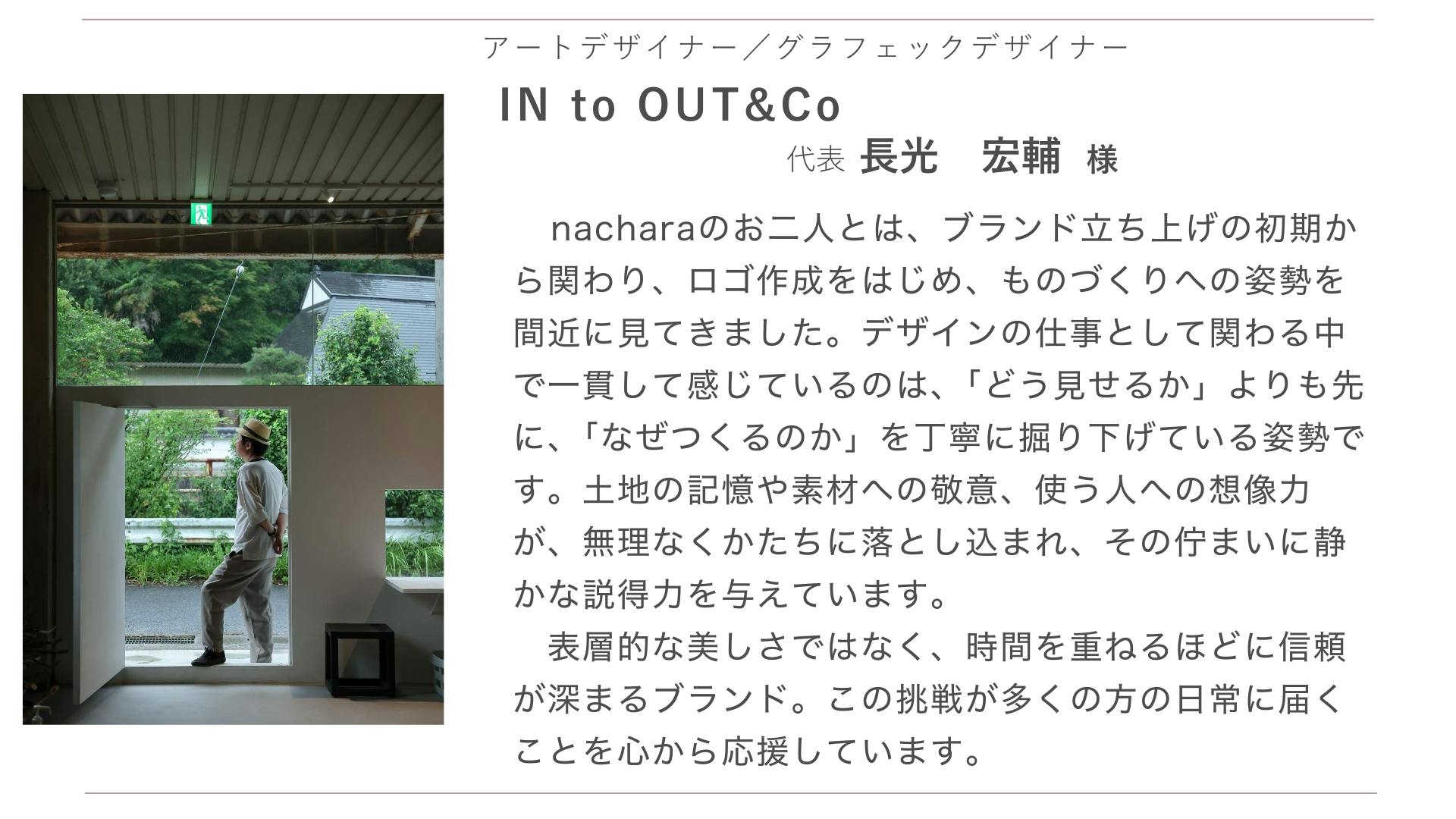 nacharaは、「奈良(nara)」と「お茶(cha=自然の気配)」を内包した造語。自然の中に身を置いたときに感じる、空気・湿度・香り・静けさ--そうした言葉にならない感覚を映す名前です。背景にある「自然との距離感」そのものをブランド名として表現しています。