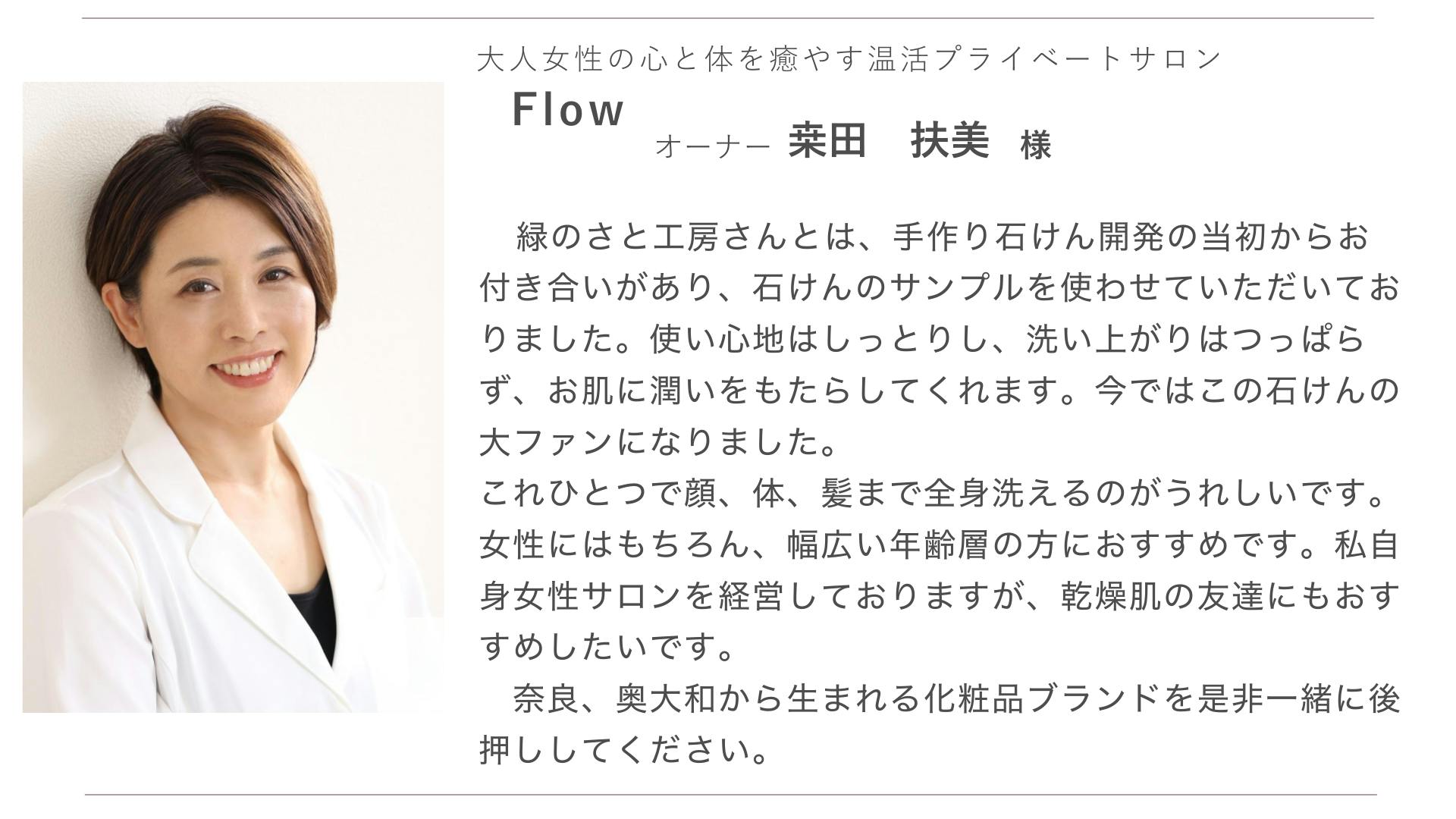 ・奥大和の恵みたっぷりなお肌と環境に優しい化粧品広めたい