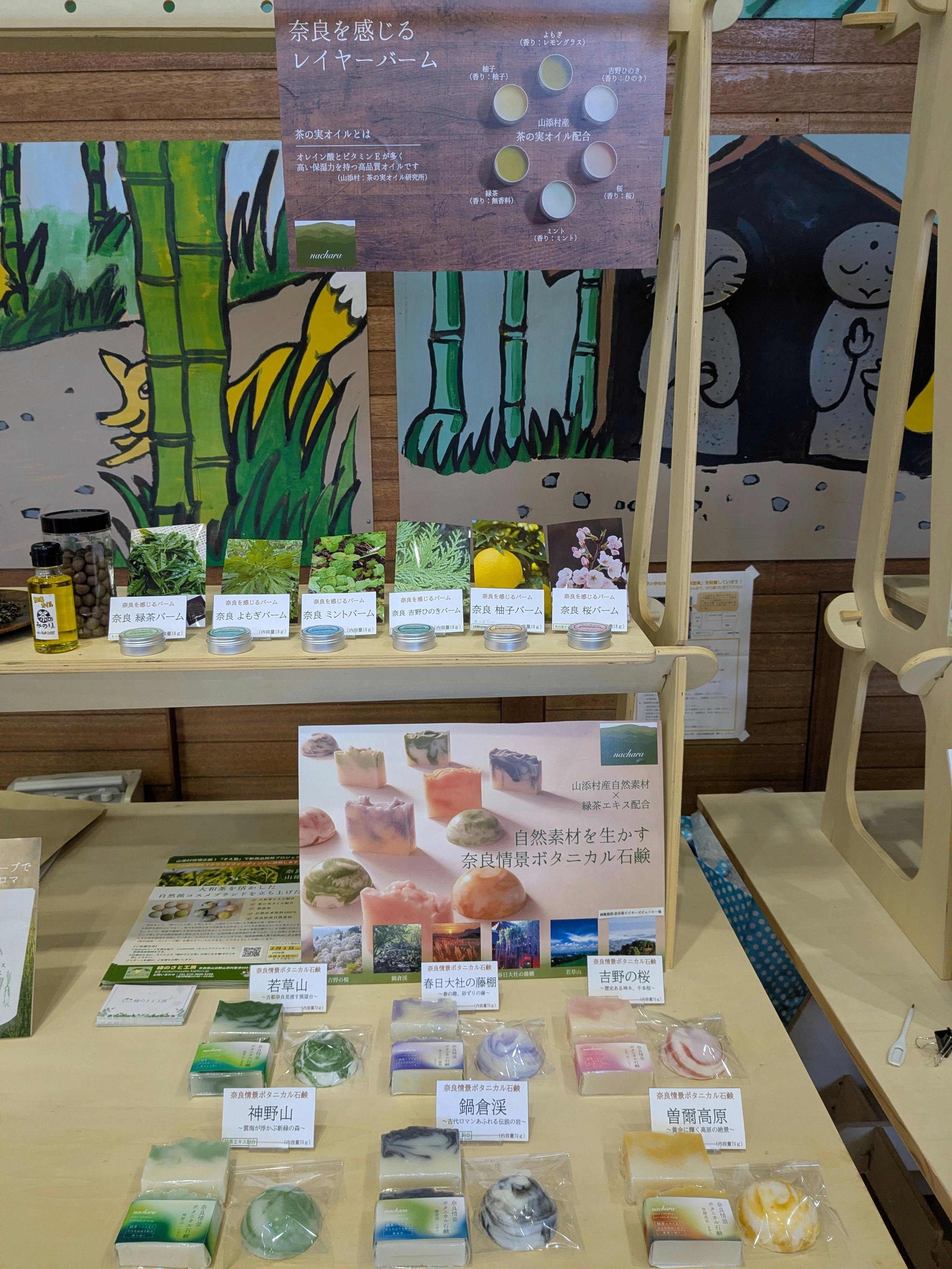 奈良や奥大和を感じるバーム(軟膏)です。山添村で栽培された柚子、よもぎ、ミント、緑茶です。奈良の思い出となるような商品を開発をしました。植物油から作った自然派バームですので安心してお使いいただけます。べたつかずさらっとお肌に馴染みます。また原材料には、山添村産の『茶の実オイル』を使用しています。