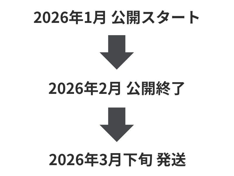 プロジェクト終了後の発送となりますので、2026年3月下旬の発送・お届けを予定しております。