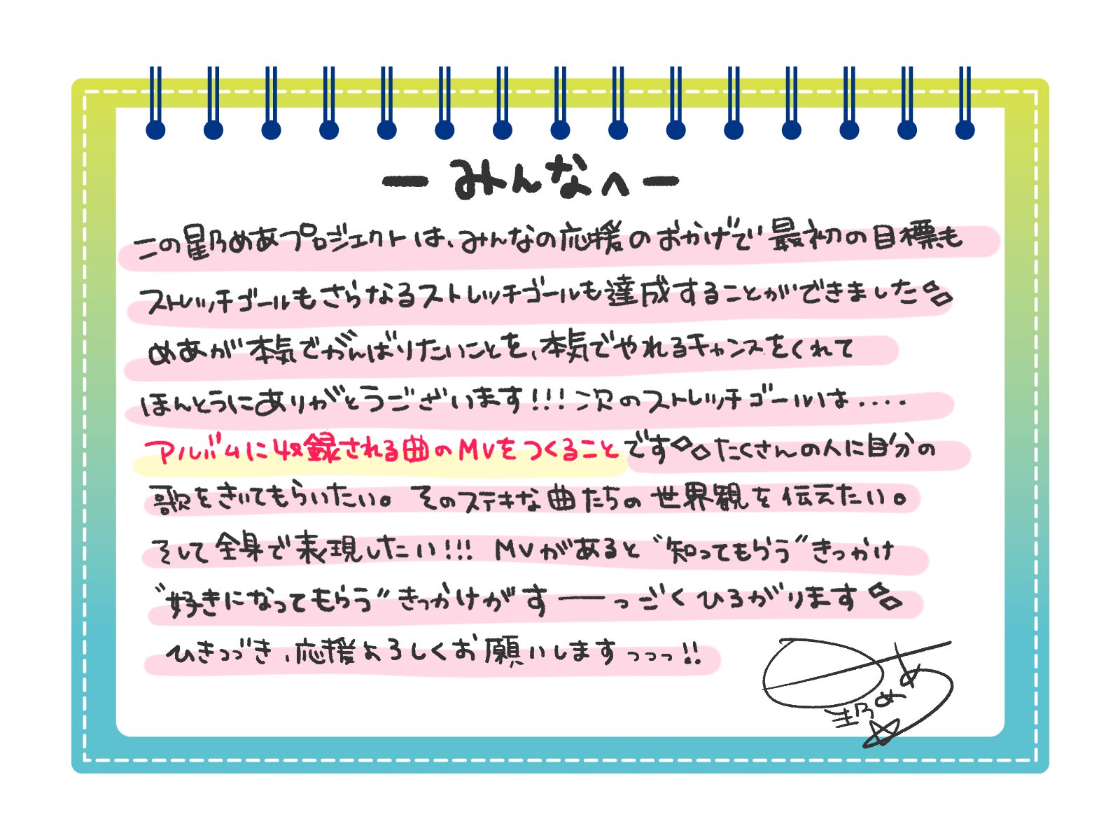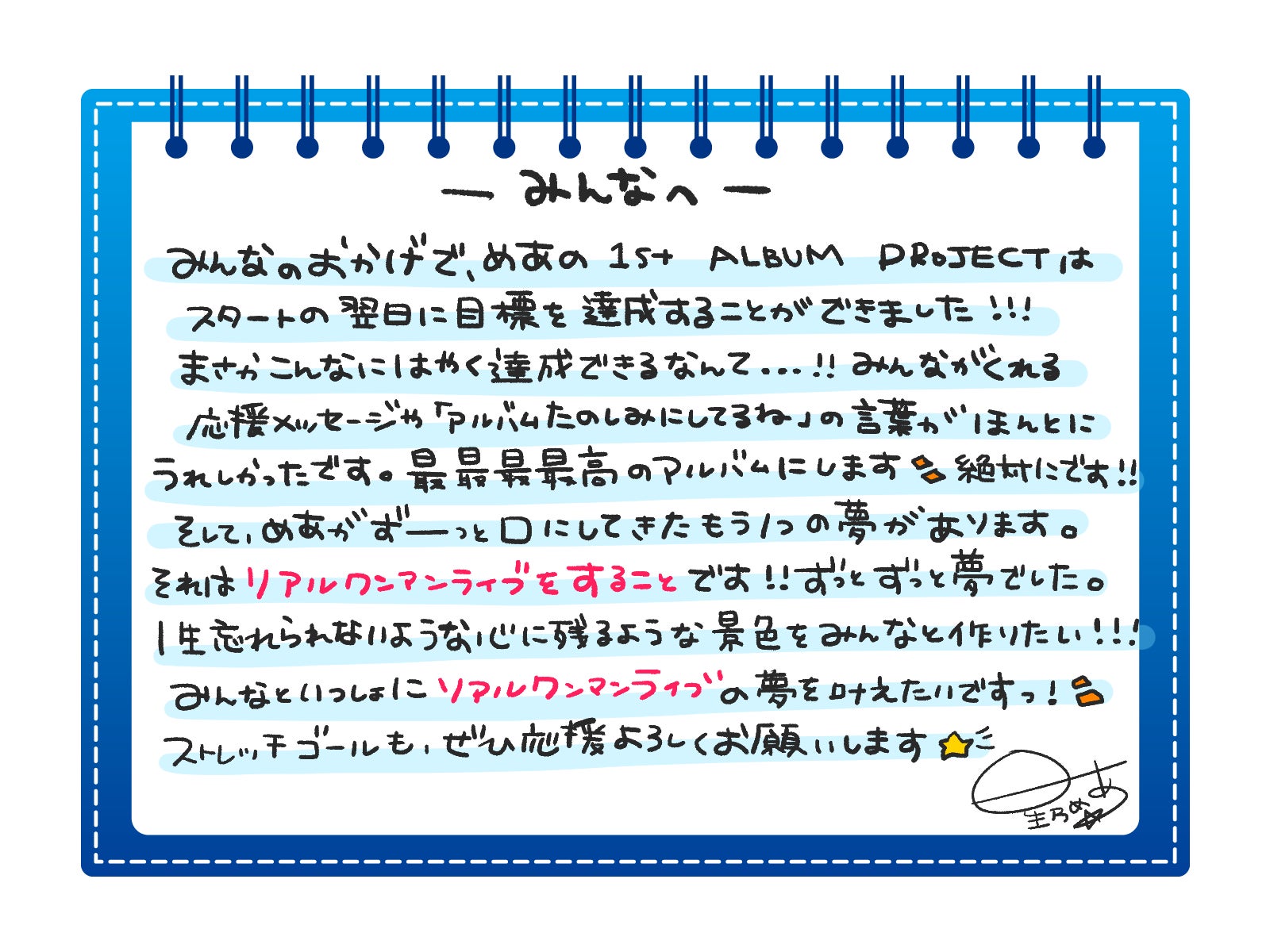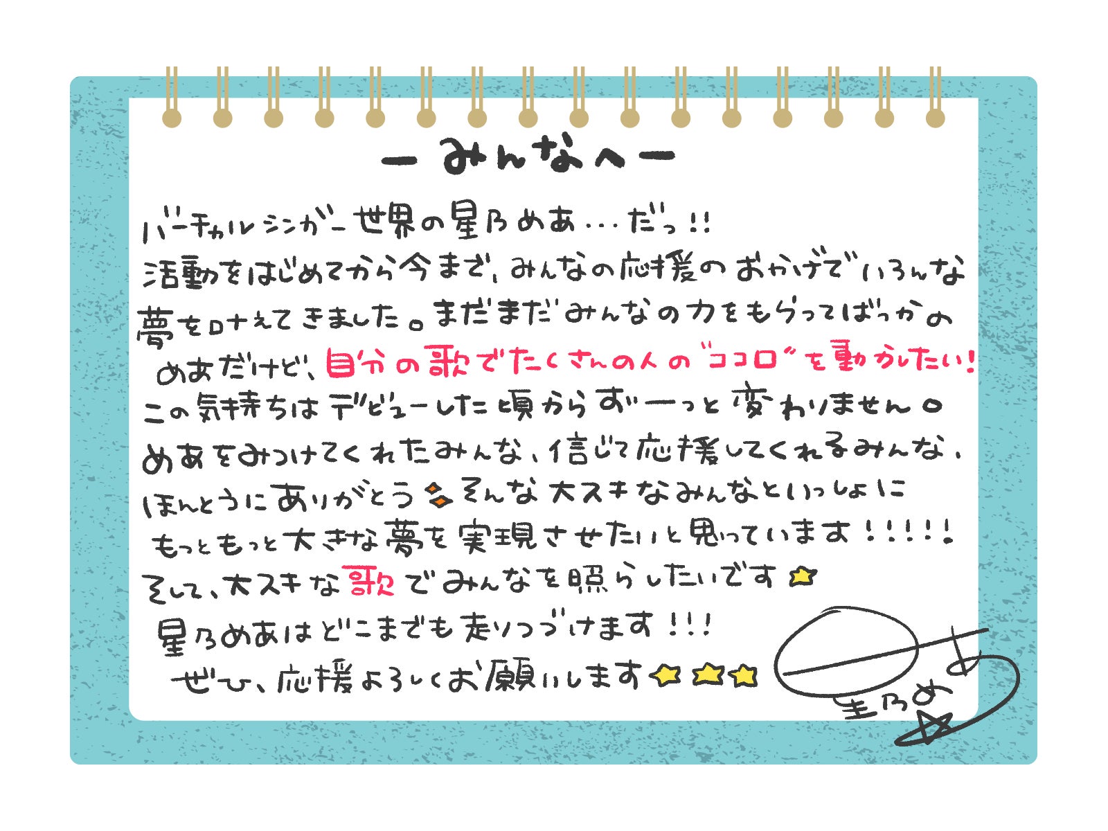 デビューからこれまでを星乃めあを応援し、支えて下さっためあめいとの皆様と共に、最高のアルバムを創りあげたいと考えております。