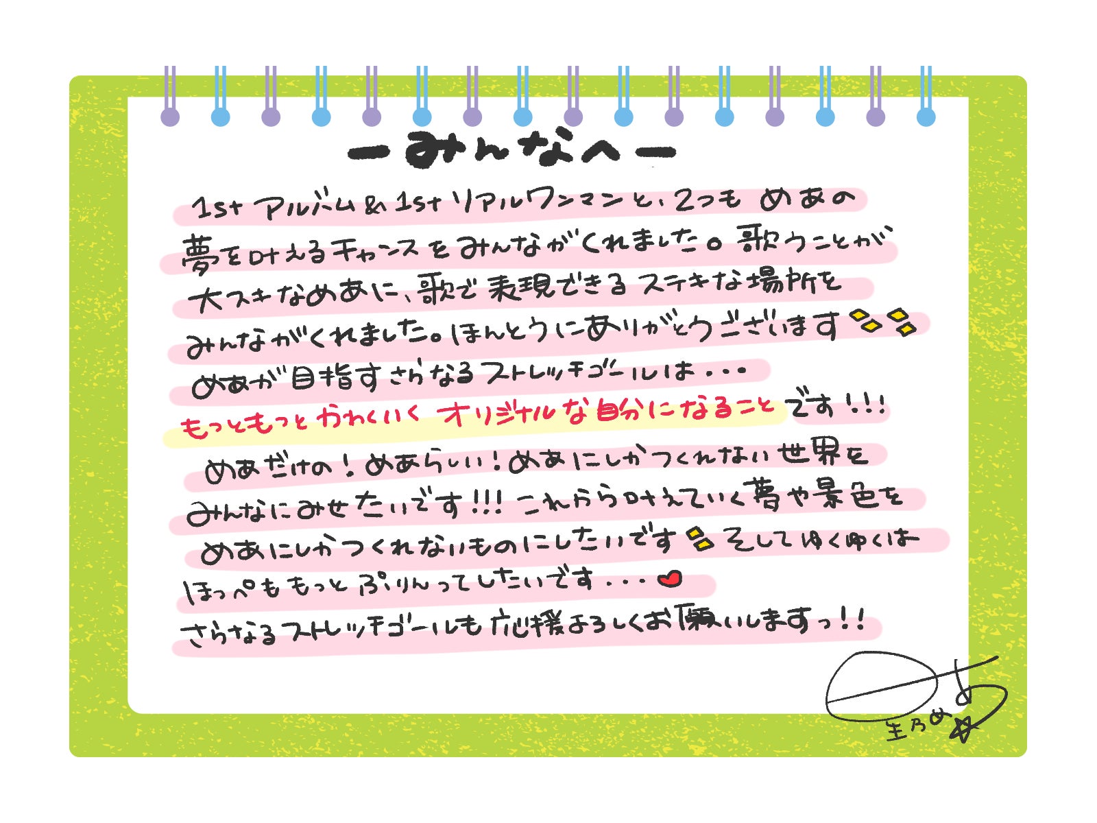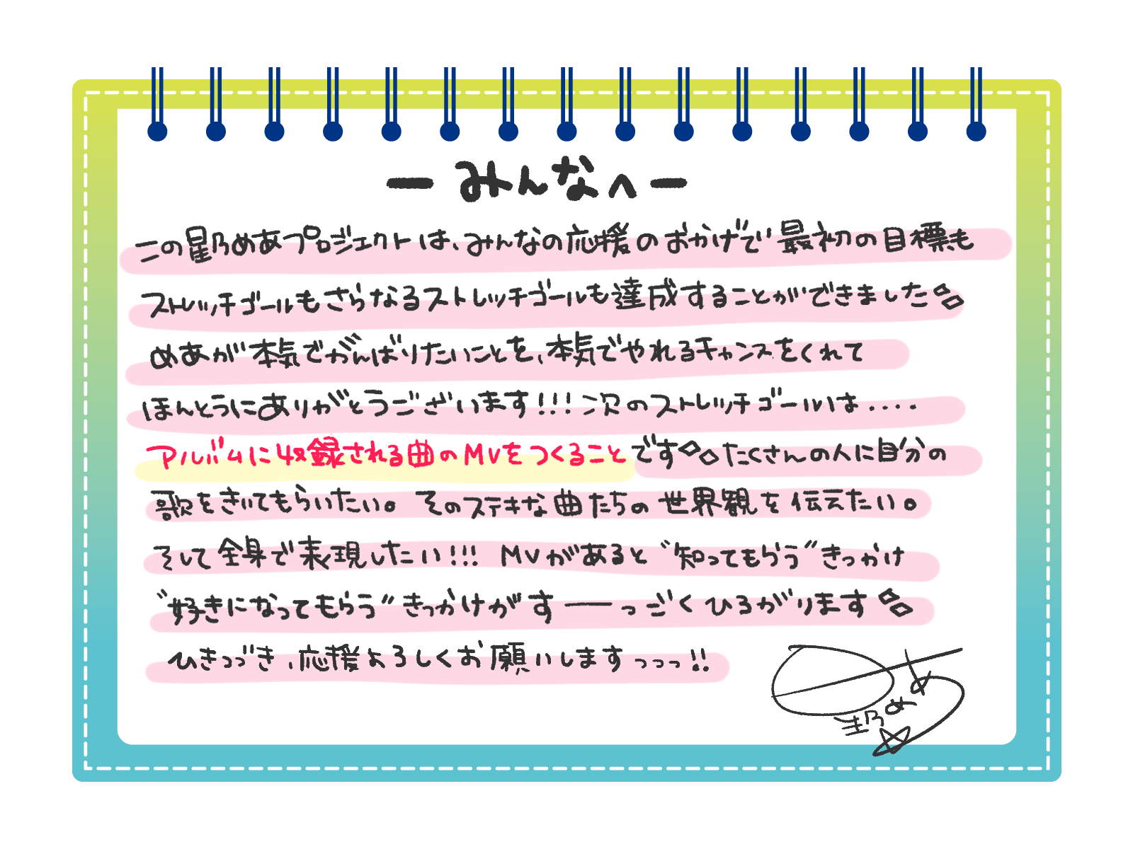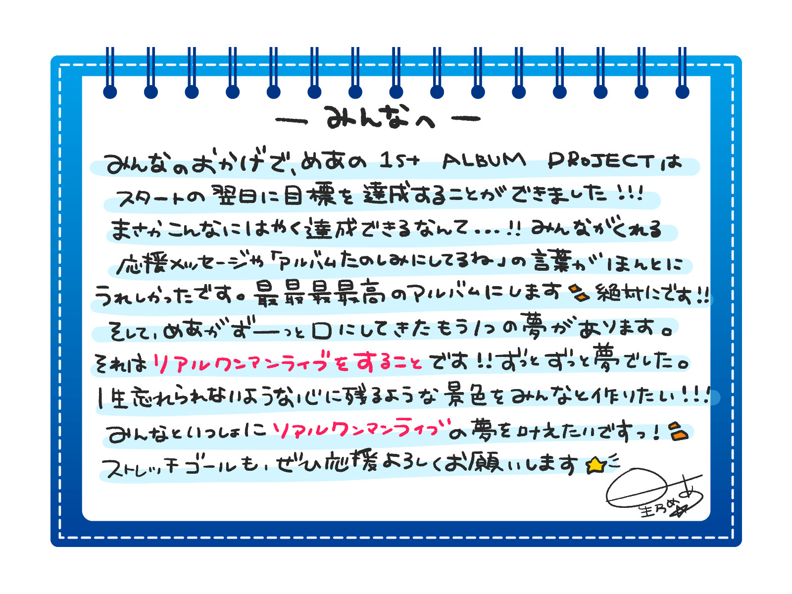 デビューからこれまでを星乃めあを応援し、支えて下さっためあめいとの皆様と共に、最高のアルバムを創りあげたいと考えております。