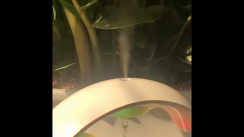 A. この霧は、キャビテンション霧と言って、超音波振動子によって水に激しい振動が加わり、水中に微小な気泡が生成され、その気泡が崩壊する時に水滴が周囲に飛び散る現象によるものです。この水滴が霧となり空気中に放出されます。
